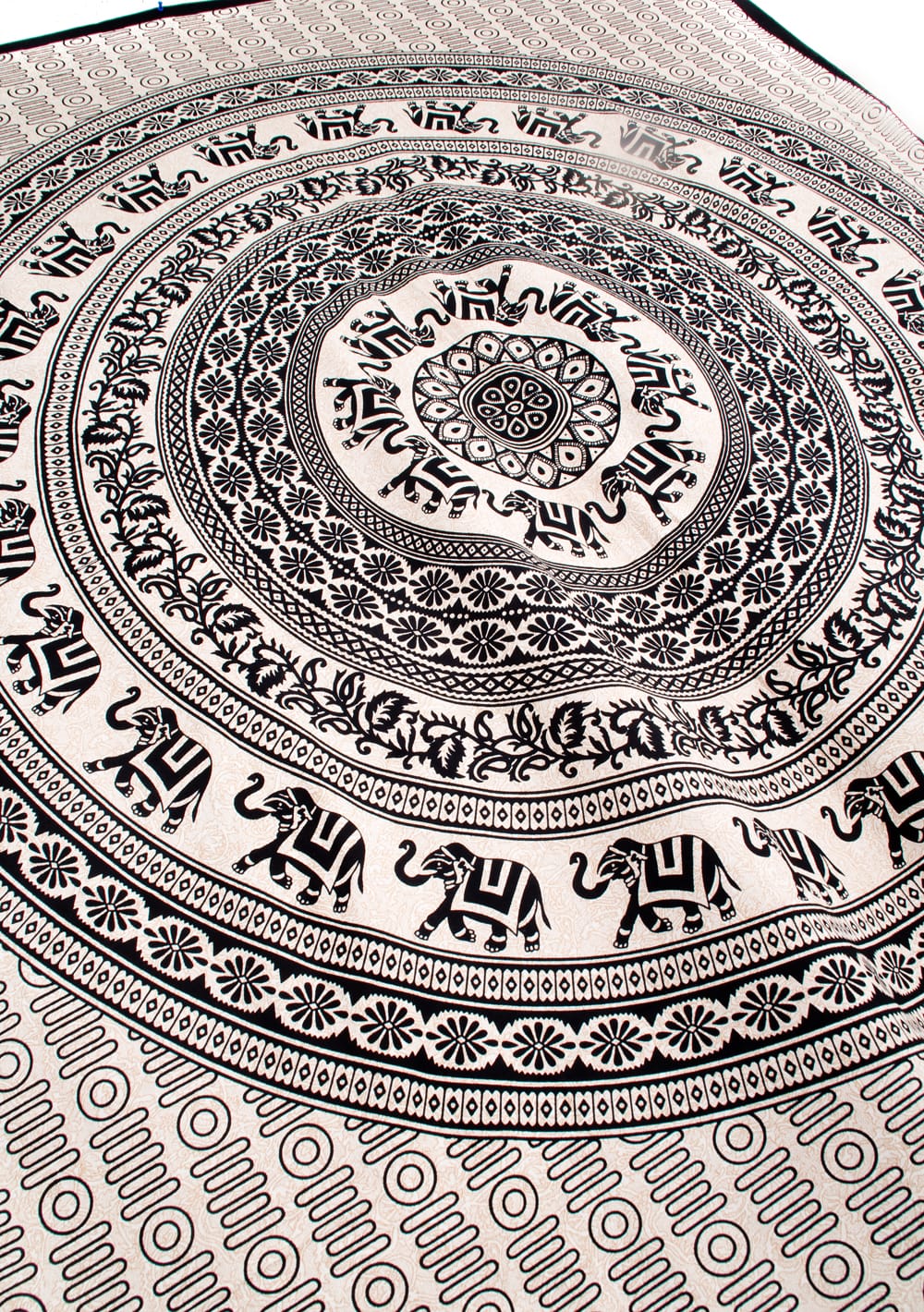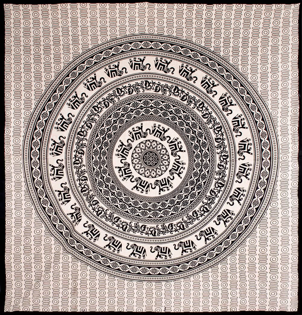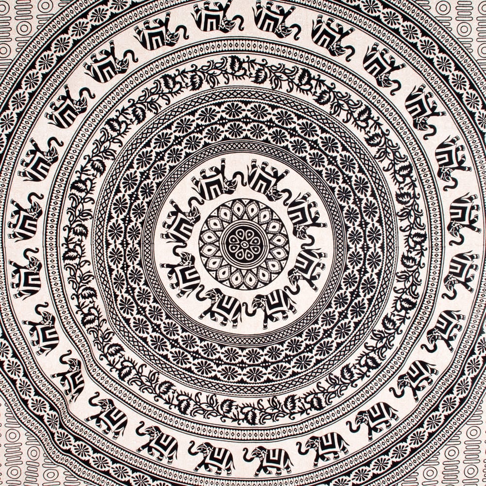 大きな布にとても丁寧に、インド伝統の唐草柄やマンダラ柄、象さんや、お花などがプリントされているので、こちら1枚をお部屋に飾るだけでアジアンなお部屋に大変身!