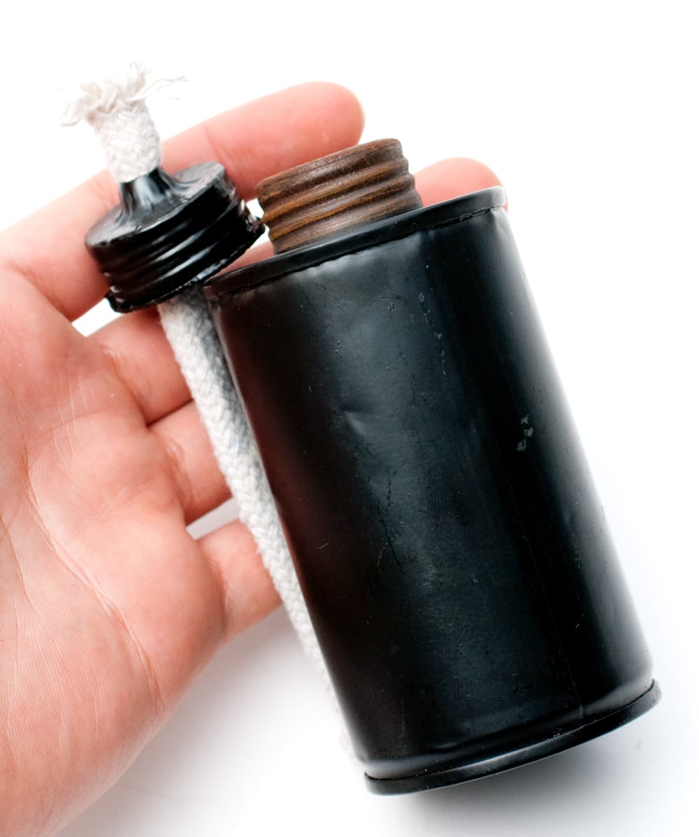 こちらが燃料ボトルになります。外に出ている灯心が長ければ長いほど、火も大きくなるので、最初は灯心を小さめに出して調節してください。