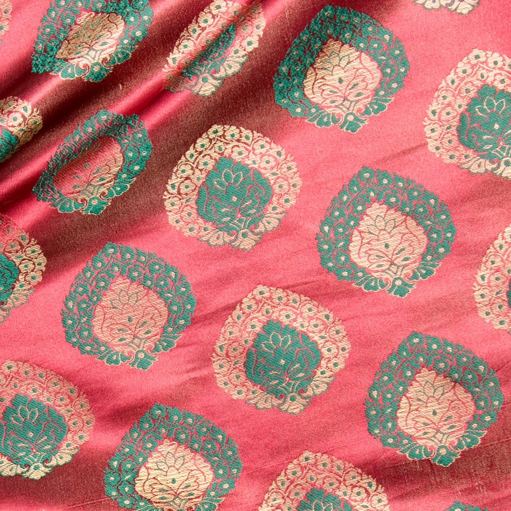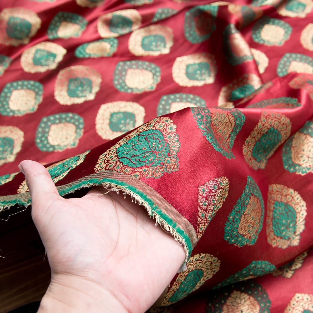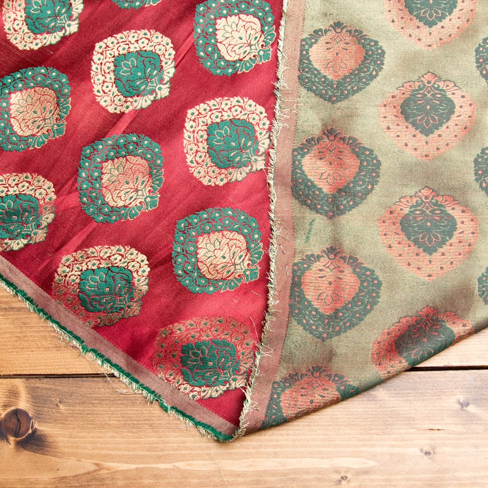 伝統的な紋様とインドらしい鮮やかなカラーリングがマッチングした素敵な布です。色合いが美しく、手芸用の布としてはもちろんインテリア用のカバーや飾り布として様々な場所でお使いいただけます。ソファカバーやカーテン、等々色々な使いみちが考えられますね。陰影が美しいので、オリジナルのスカーフや壁飾りにしても素敵です。