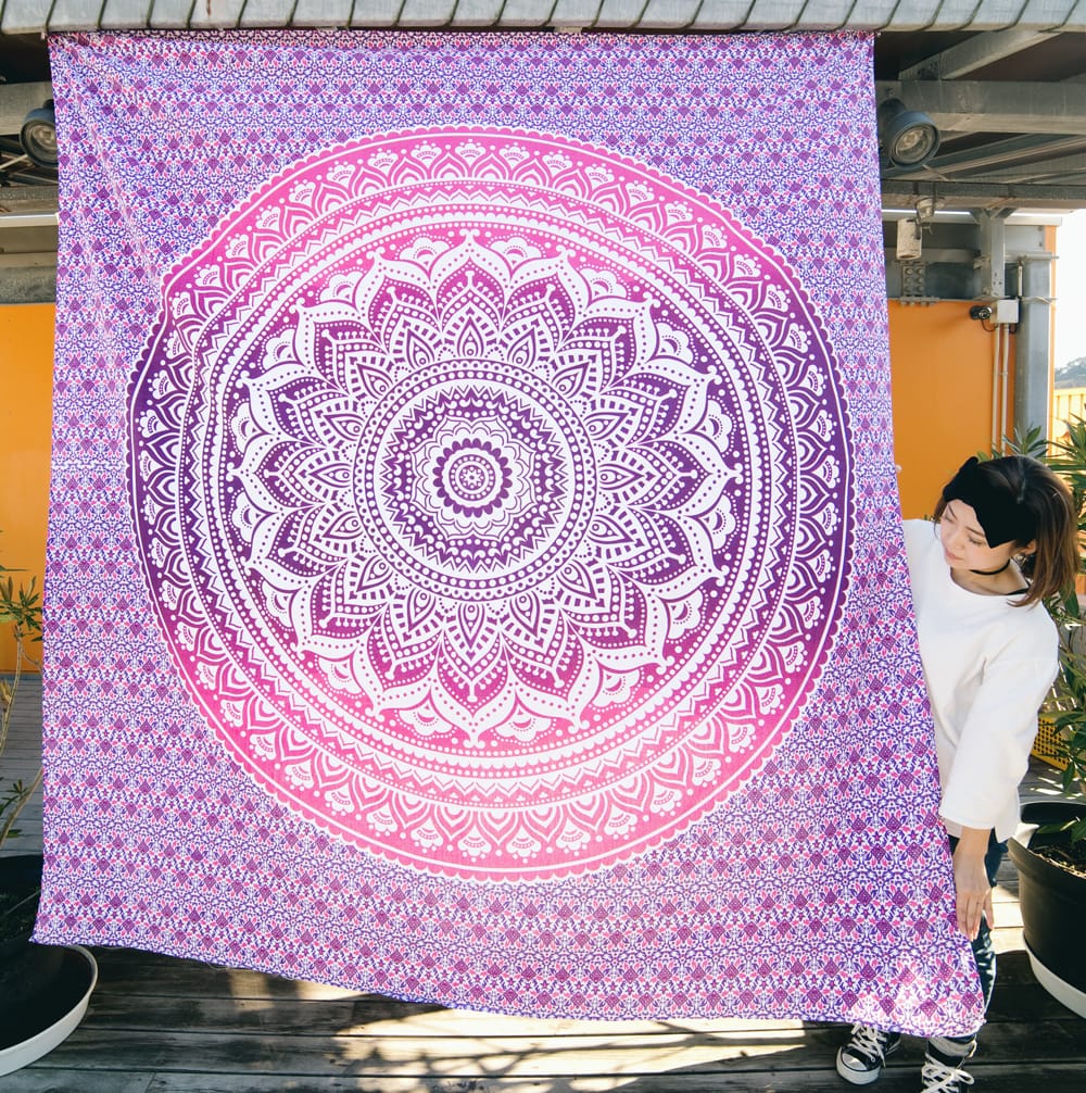 大きな布にとても丁寧に、インド伝統の唐草柄やマンダラ柄、象さんや、お花などがプリントされているので、こちら1枚をお部屋に飾るだけでアジアンなお部屋に大変身!