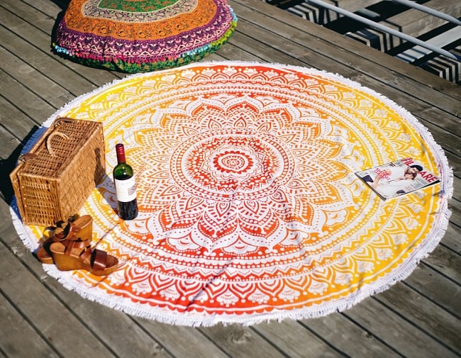 ビーチやバーベキューの予定などはまったくないので(泣)、お部屋のインテリアとして購入しました。四角い布はよくありがちだけど、こういう円形の布が欲しくてずっと探していました。プリントもきれいで縁取りのふさもいい味出してる。