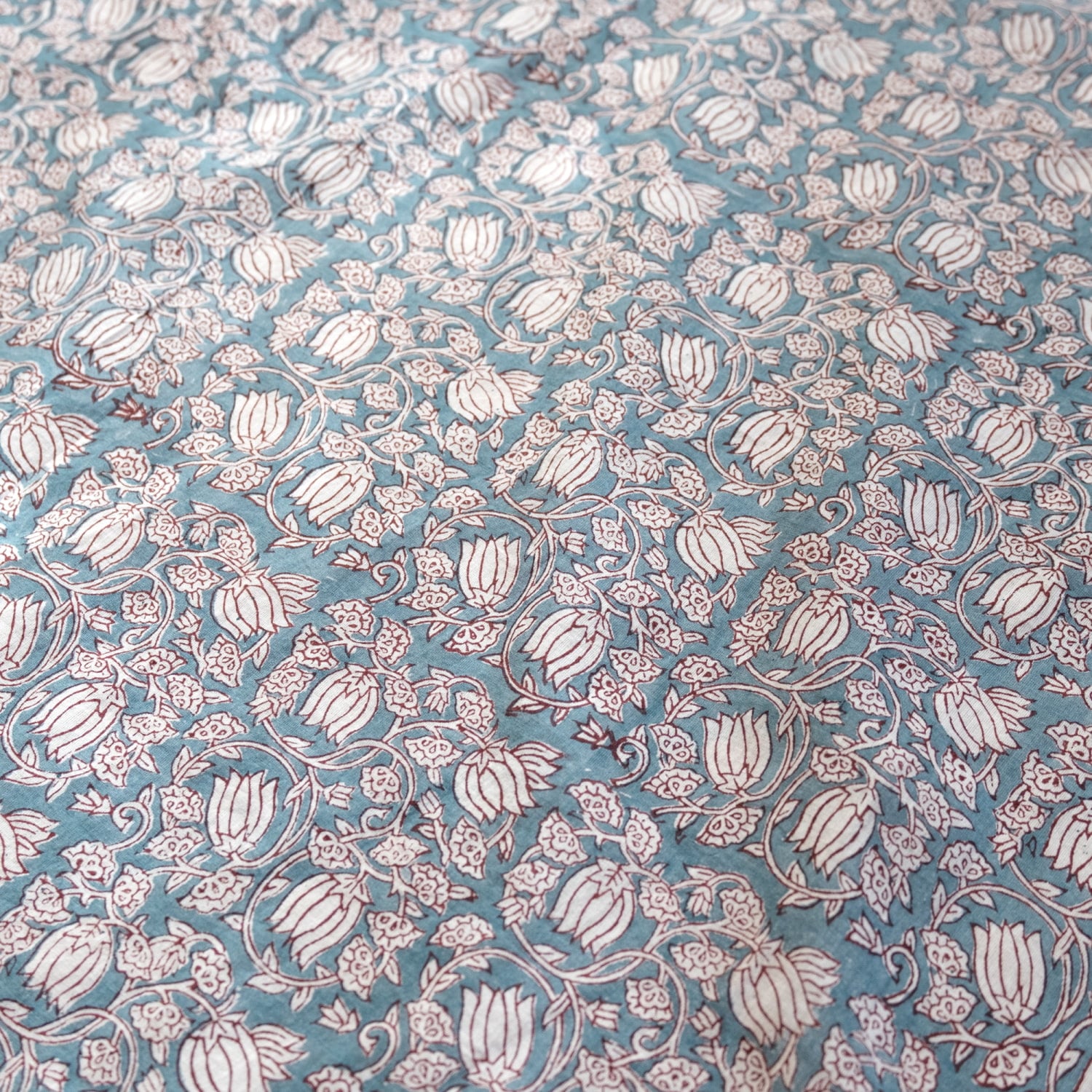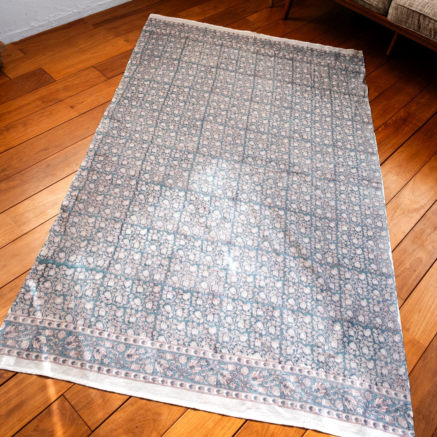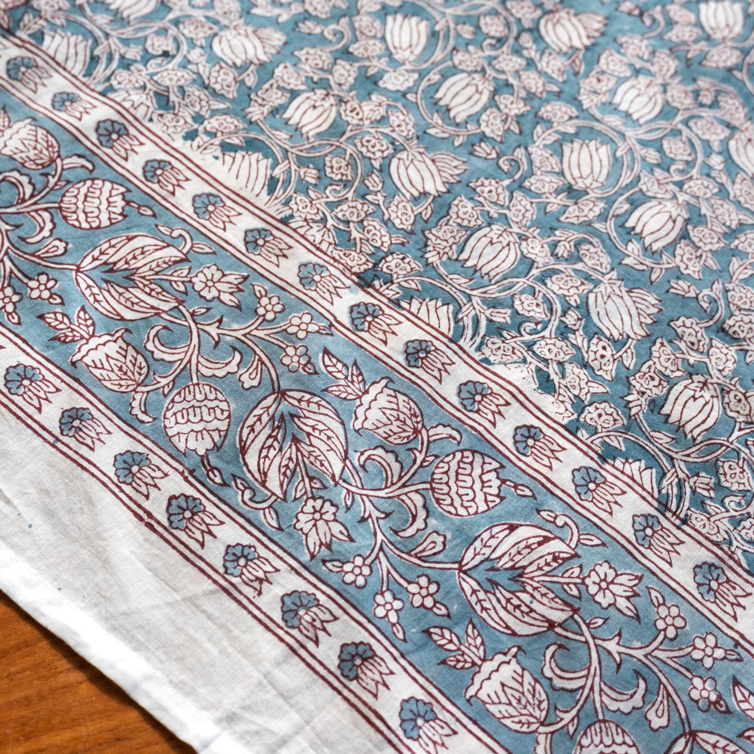 ウッドブロック(木版)を用いて一つ一つ模様を染めこんだ優雅で贅沢な仕上がりの布です。色が変わるたびに版を交換するため非常に時間のかかる丁寧な手仕事の賜物といえます。インドは美しい布の宝庫ですが、その中でも特に素敵な一枚に仕上がっています。藍染部分には、ハンドメイドのウッドブロックプリントにしか出せない、独特のムラがありとても雰囲気があります