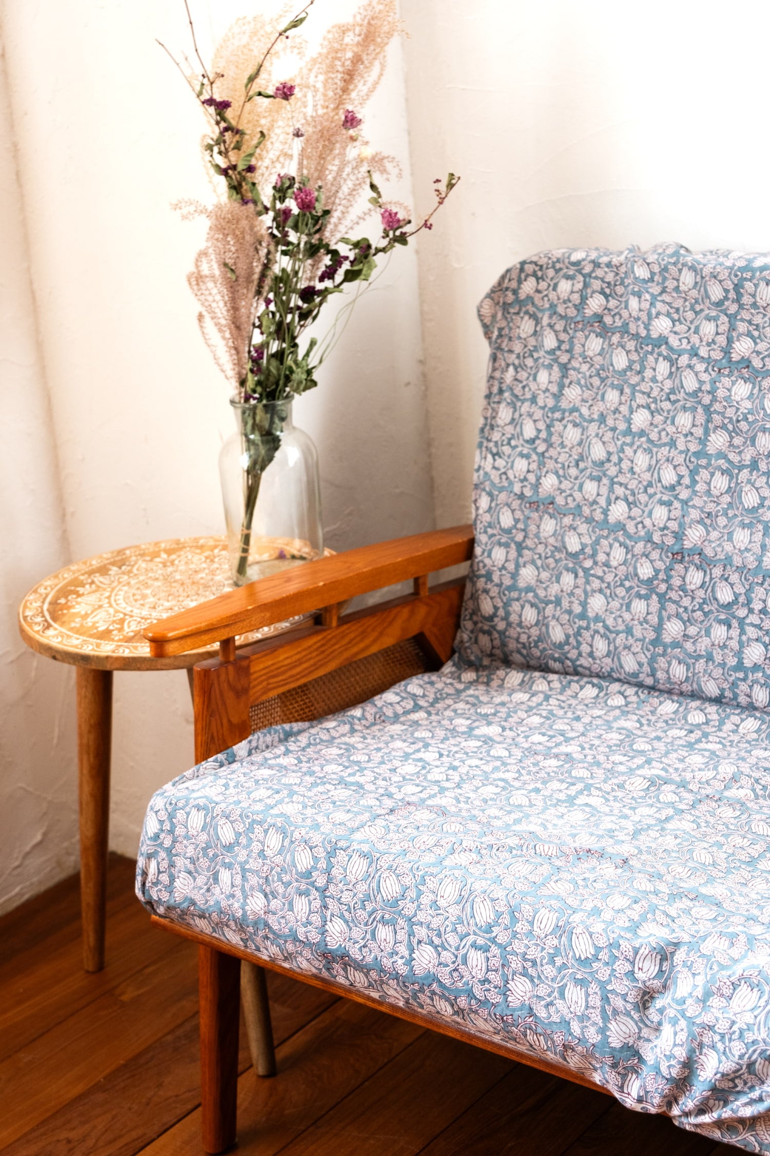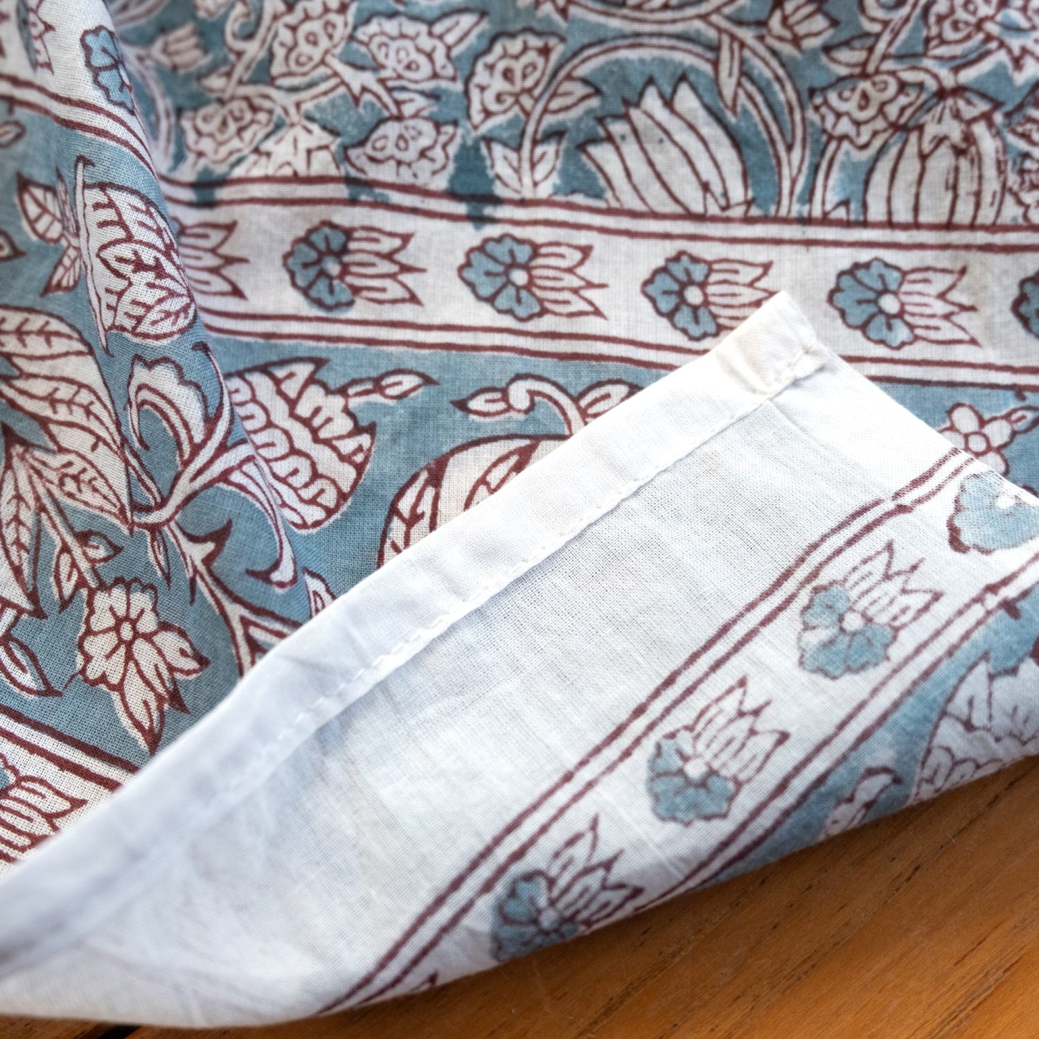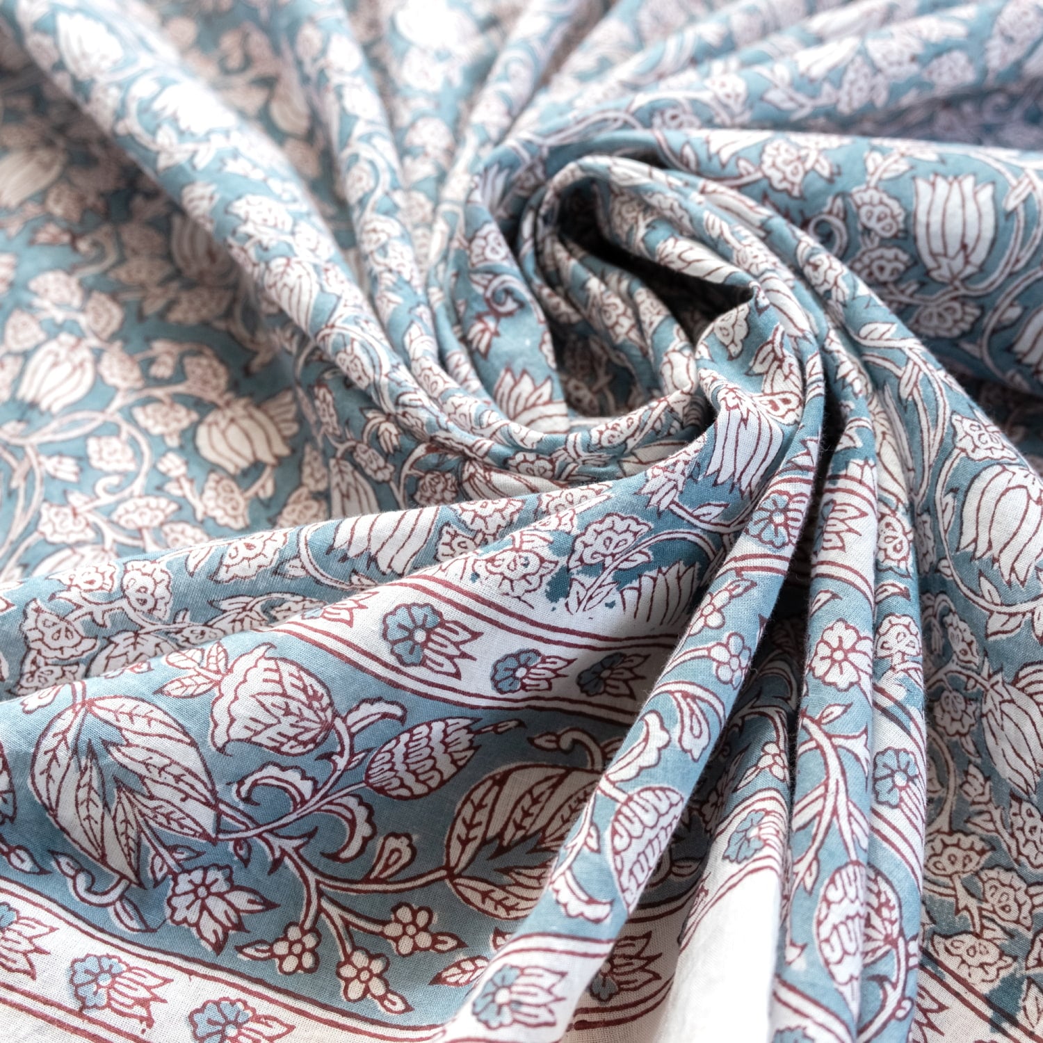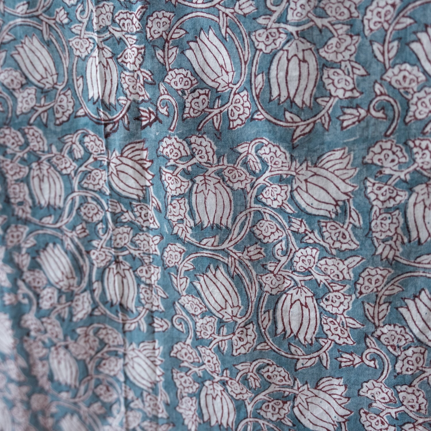 ウッドブロック(木版)を用いて一つ一つ模様を染めこんだ優雅で贅沢な仕上がりの布です。色が変わるたびに版を交換するため非常に時間のかかる丁寧な手仕事の賜物といえます。インドは美しい布の宝庫ですが、その中でも特に素敵な一枚に仕上がっています。藍染部分には、ハンドメイドのウッドブロックプリントにしか出せない、独特のムラがありとても雰囲気があります