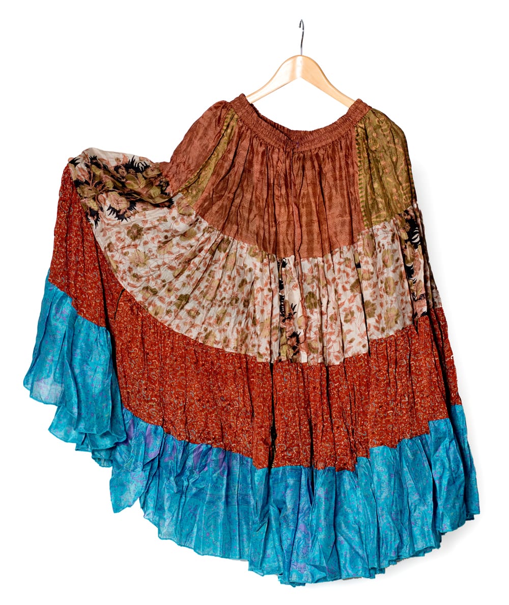 使われているサリー生地は層のようにトータル4種類。それぞれをつなぎ合わせたパッチワークになっています。さらに、アンティークサリーなので、それぞれが同じ組み合わせのない一点もの。自分だけの特別な1枚になりますよ。また、お送りするスカートは、ハンガーに掛けて片方を広げてある写真一枚目の物となります。