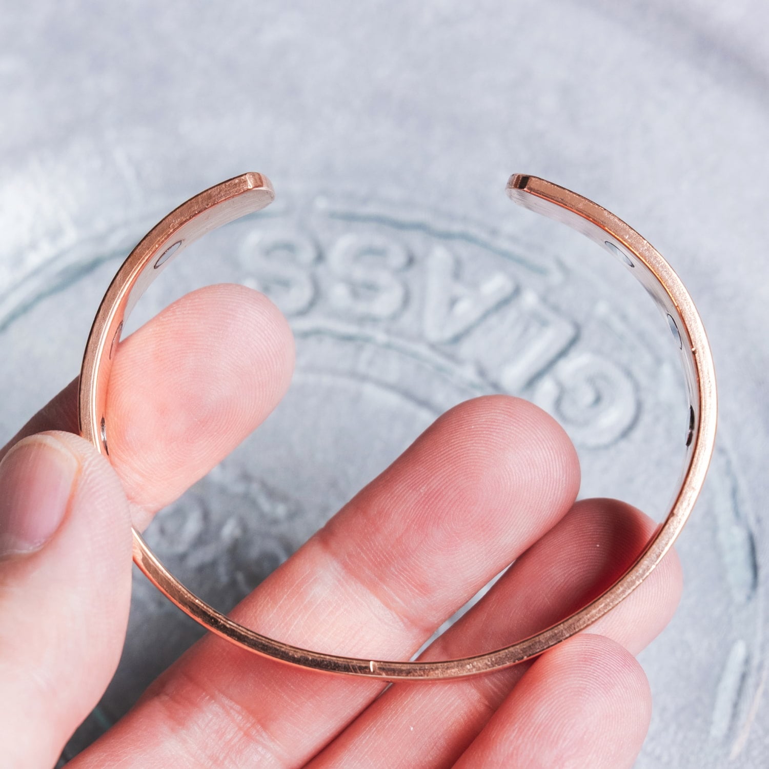 このバングルの特徴のひとつが、内側にマグネットを合計6個内蔵している点です。片側3個ずつ、左右にバランスよく配置されており、すっきりした見た目の中にも個性的な仕様がしっかりと感じられます。シンプルな鏡面仕上げと、オーンのワンポイント、さらに内蔵マグネットが組み合わさった、存在感のあるデザインです。銅の素材感を楽しみたい方にも、さり気なくインドらしさを取り入れたい方にもおすすめです。