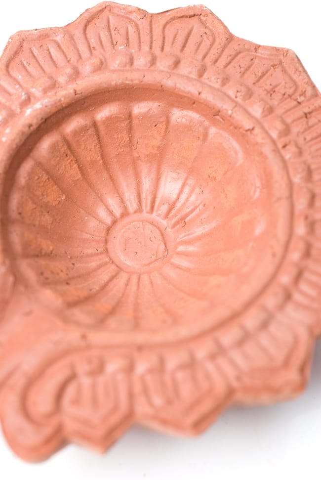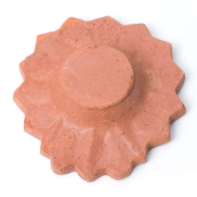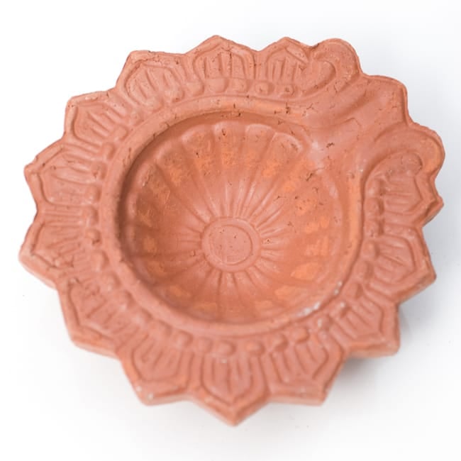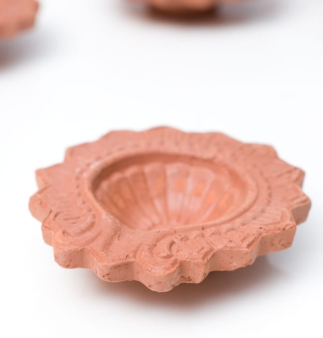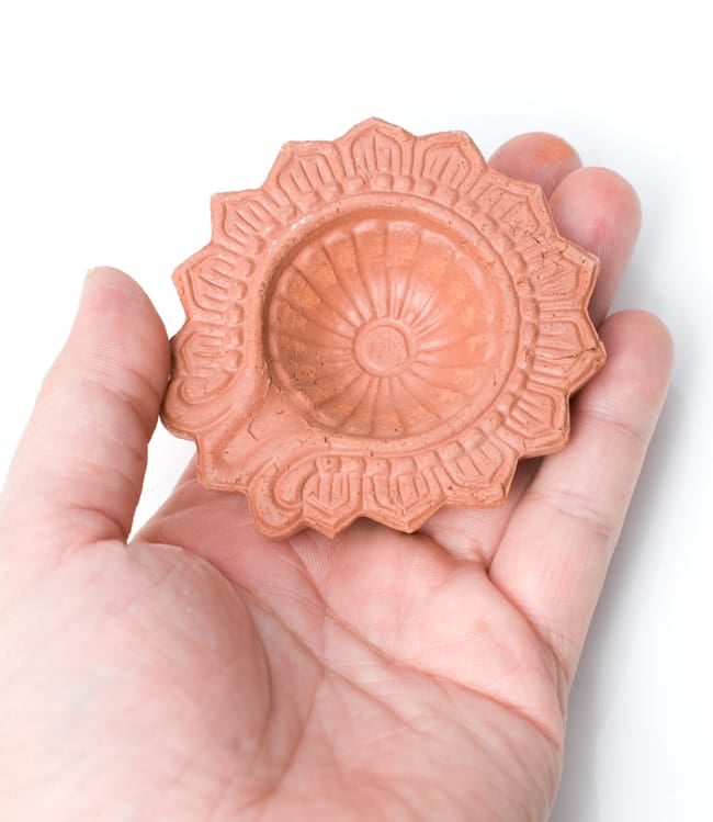 インドでは10月下旬にディワリと言う明かりを燃やして祝う祭りがあり、礼拝用のランプベースとして使用します。一個一個手で土をこね、型に入れて作った素焼きの皿です。インドでは礼拝用のランプベースとして使用しますが、お香皿にしても良いですし、また何か小さいものを入れておくときにも重宝します。アクセサリー入れとしても、リングやピアスにピッタリの大きさです。手作りの為、それぞれ模様や若干大きさの違いがありますが、どれも味がありますよ!お部屋のインテリアにお楽しみ下さいませ。
