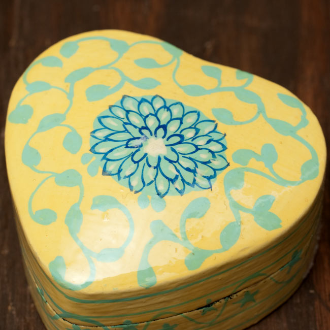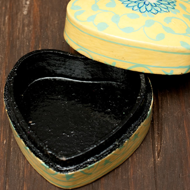 ![カシミールのペーパーマッシュ - ハート型唐草イエロー小物入れ[中] 4 - フタを開けてみたところです](https://www.tirakita.com/id_cflsp/Photos/id_cflsp_297_4b.jpg)