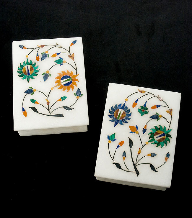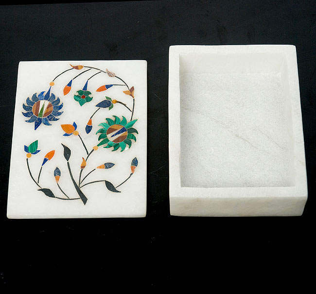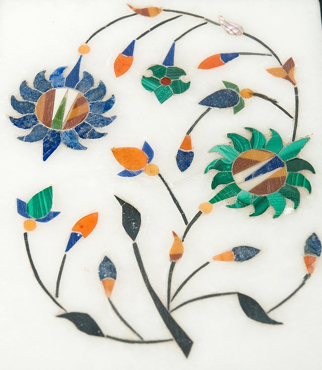 純白のホワイトマーブル(白大理石)を基調とし、マラカイト(孔雀石)、ラピスラズリ、ターコイズ、オニキスなどの貴石や貝殻をふんだんに散りばめたデザインなので、全体に高級感が漂っています。とりわけ、マラカイトは心身の癒やしに優れたパワーストーンとしても有名な貴石です。■手作りならではの温もり