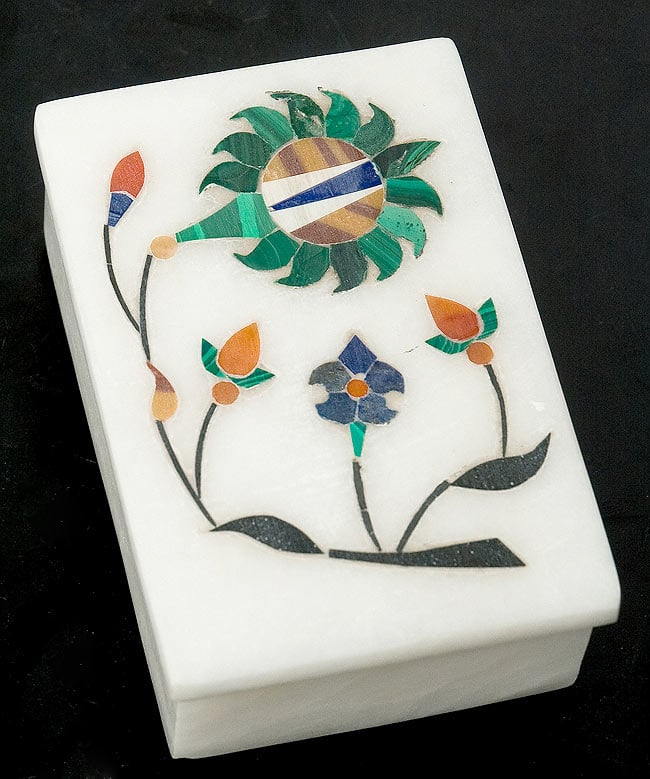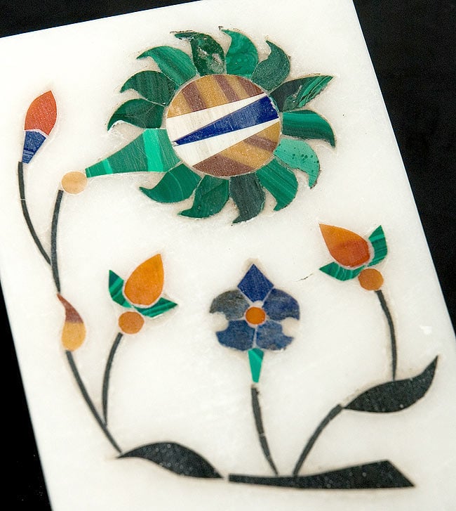 純白のホワイトマーブル(白大理石)を基調とし、マラカイト(孔雀石)、ラピスラズリ、ターコイズ、オニキスなどの貴石や貝殻をふんだんに散りばめたデザインなので、全体に高級感が漂っています。とりわけ、マラカイトは心身の癒やしに優れたパワーストーンとしても有名な貴石です。■手作りならではの温もり