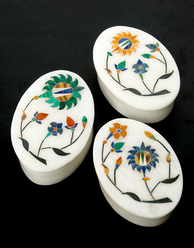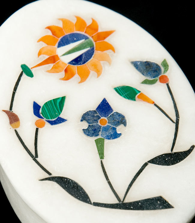 純白のホワイトマーブル(白大理石)を基調とし、マラカイト(孔雀石)、ラピスラズリ、ターコイズ、オニキスなどの貴石や貝殻をふんだんに散りばめたデザインなので、全体に高級感が漂っています。とりわけ、マラカイトは心身の癒やしに優れたパワーストーンとしても有名な貴石です。■手作りならではの温もり