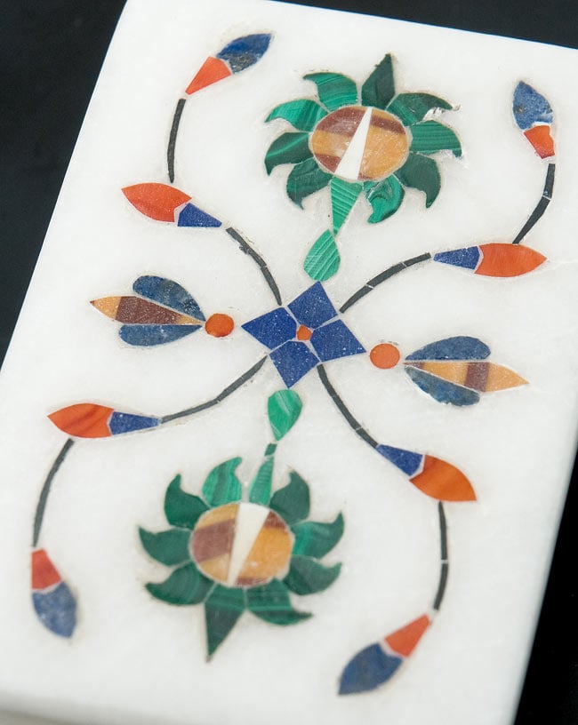 純白のホワイトマーブル(白大理石)を基調とし、マラカイト(孔雀石)、ラピスラズリ、ターコイズ、オニキスなどの貴石や貝殻をふんだんに散りばめたデザインなので、全体に高級感が漂っています。とりわけ、マラカイトは心身の癒やしに優れたパワーストーンとしても有名な貴石です。■手作りならではの温もり