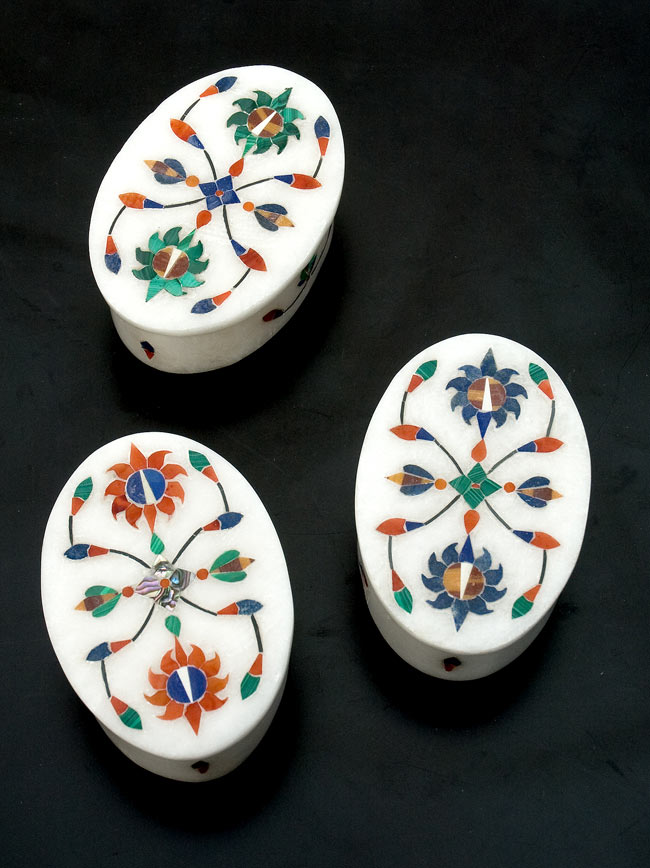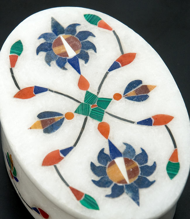 純白のホワイトマーブル(白大理石)を基調とし、マラカイト(孔雀石)、ラピスラズリ、ターコイズ、オニキスなどの貴石や貝殻をふんだんに散りばめたデザインなので、全体に高級感が漂っています。とりわけ、マラカイトは心身の癒やしに優れたパワーストーンとしても有名な貴石です。■手作りならではの温もり