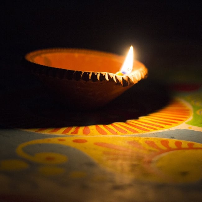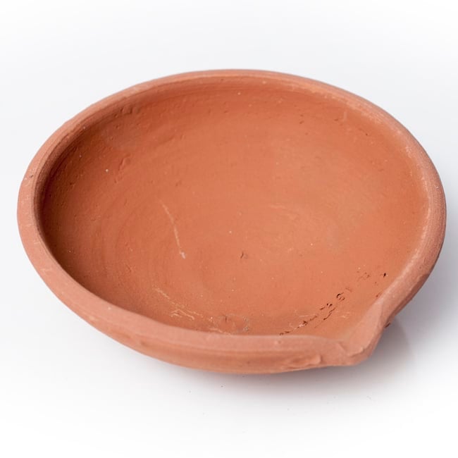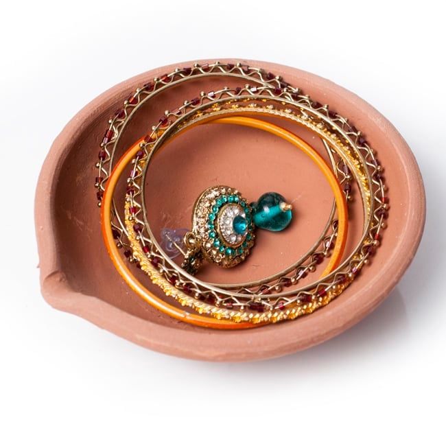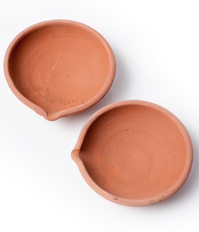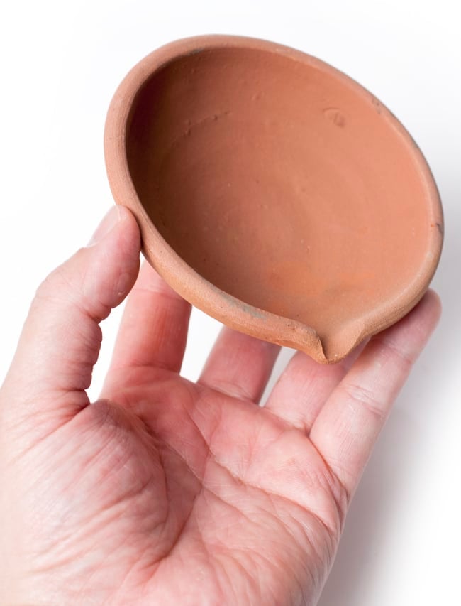 インドでは10月下旬にディワリと言う明かりを燃やして祝う祭りがあり、礼拝用のランプベースとして使用します。一個一個手で土をこね、型に入れて作った素焼きの皿です。インドでは礼拝用のランプベースとして使用しますが、お香皿にしても良いですし、また何か小さいものを入れておくときにも重宝します。アクセサリー入れとしても、リングやピアスにピッタリの大きさです。手作りの為、それぞれ模様や若干大きさの違いがありますが、どれも味がありますよ!お部屋のインテリアにお楽しみ下さいませ。