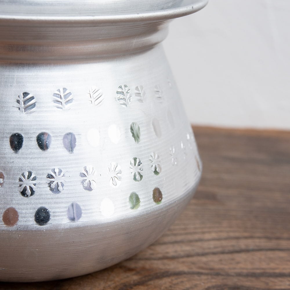 | ご注意 | インドのアルミ製品ですので、汚れやへこみがございます。酷いものは取り除きますが、ある程度ご了承の上お買い求めいただければ幸いです。 |