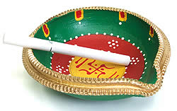 インドでは10月下旬にディワリと言う明かりを燃やして祝う祭りがあるのですが、そのときに使われる綺麗なお皿を、ティラキタ用に特別彩色してもらいました。手のひらに乗るサイズの素焼きのお皿に、インドの職人が一つ一つ手で綺麗に彩色した一品です。