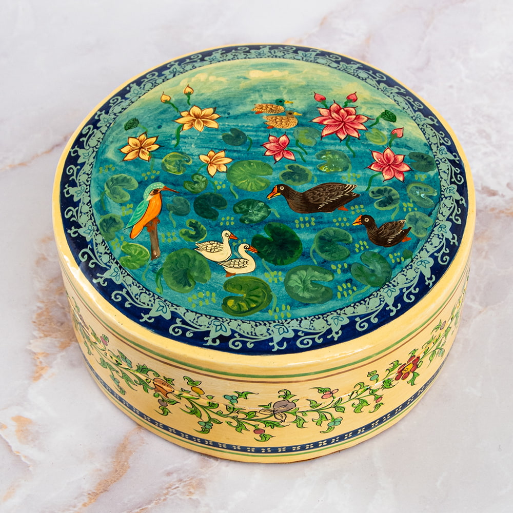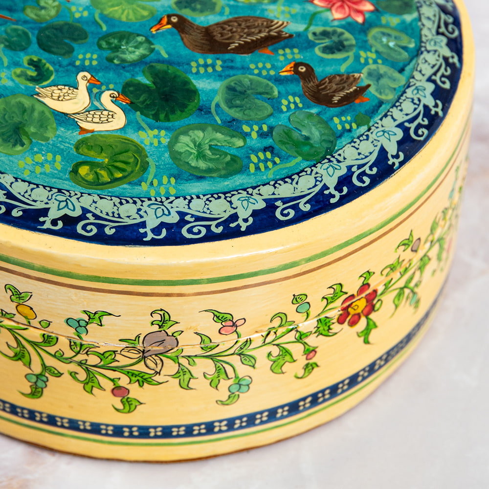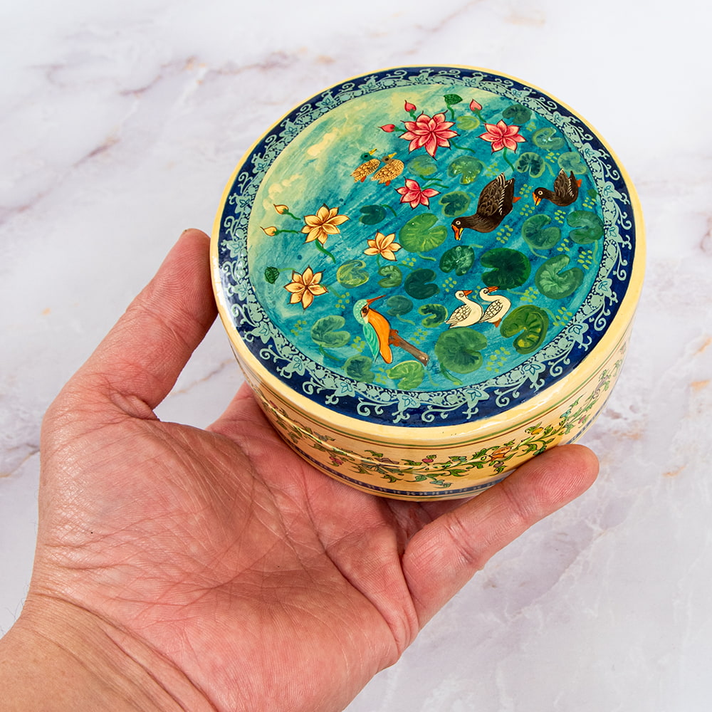 【超高精細・一点もの】カシミールのペーパーマッシュ 鳥の園 円形小物入れ 約11cm x 約11cm 通販店
