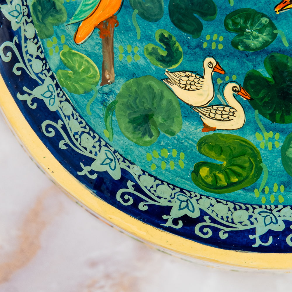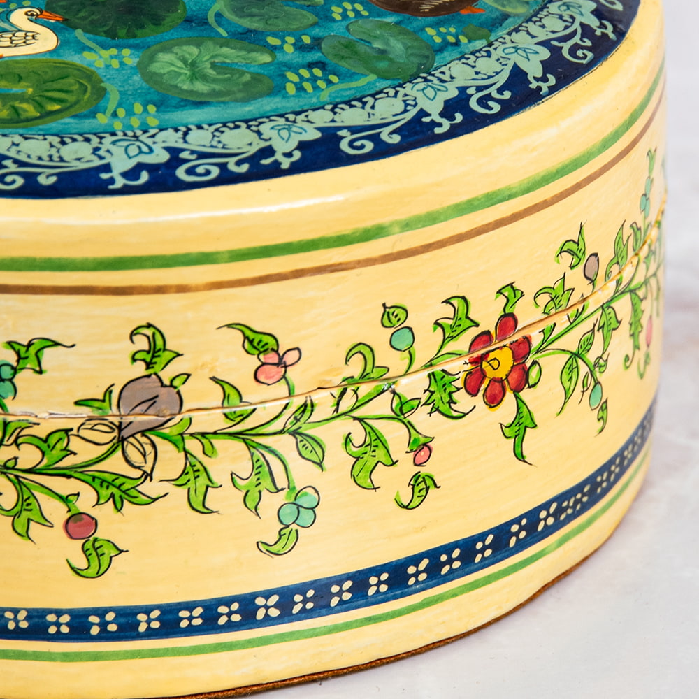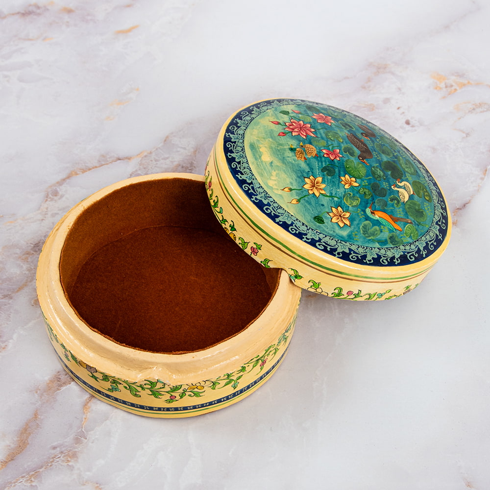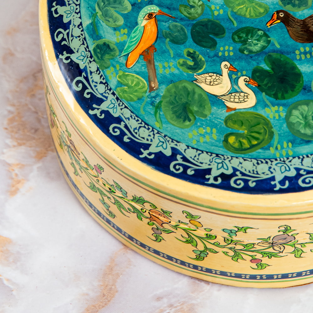 【超高精細・一点もの】カシミールのペーパーマッシュ 鳥の園 円形小物入れ 約11cm x 約11cm 通販店