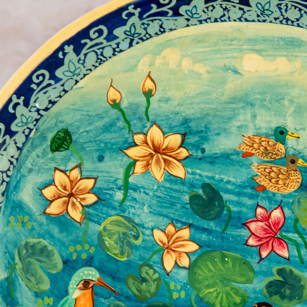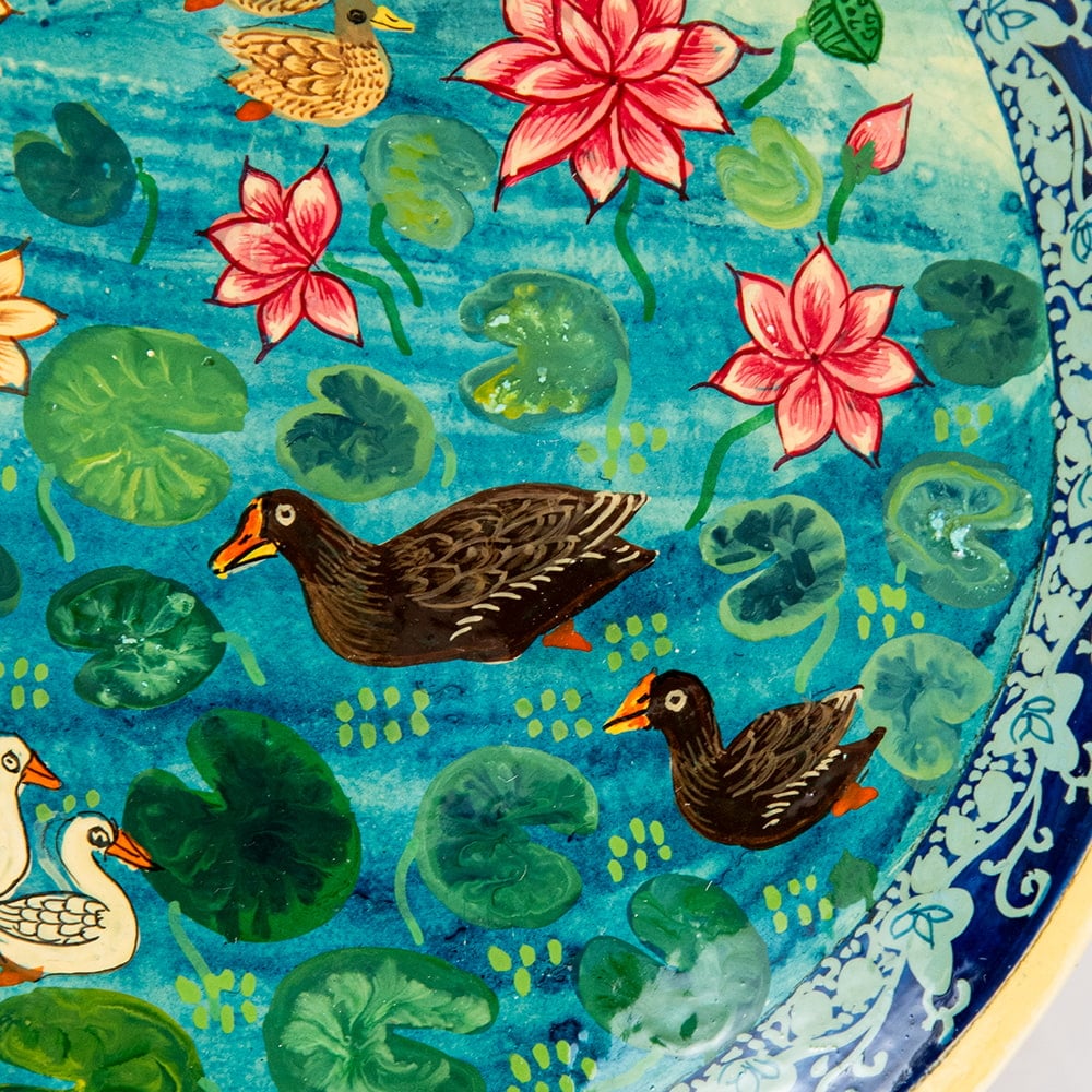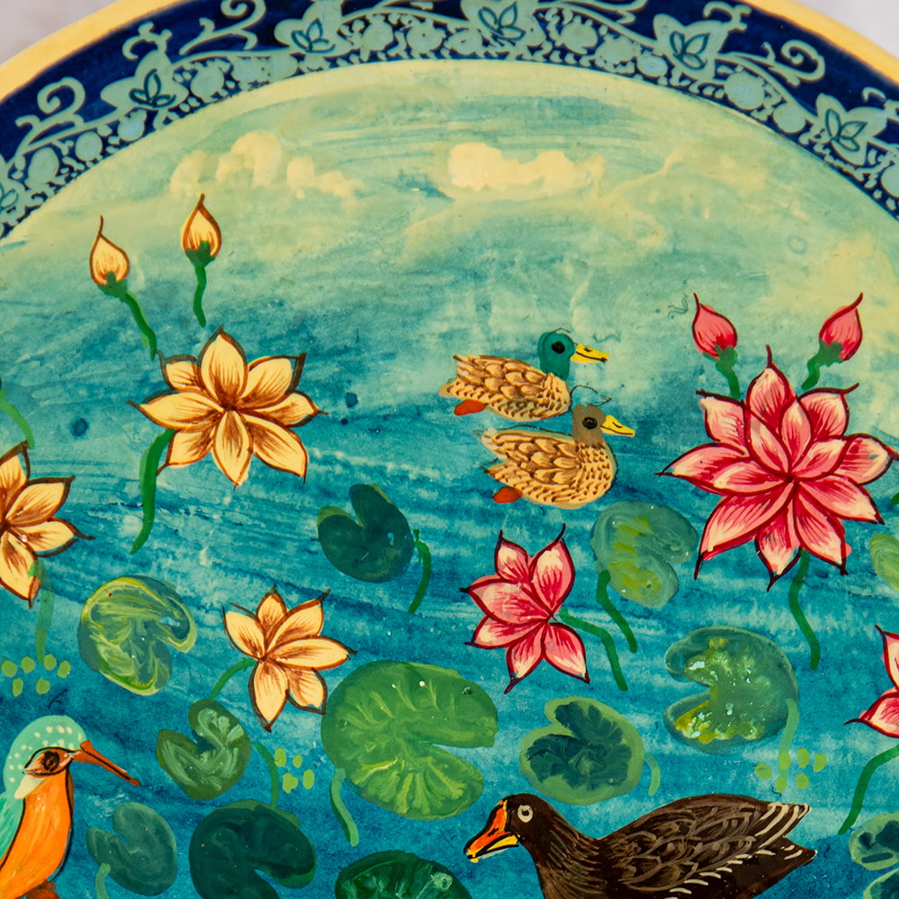 そんな伝統息づくカシミールでも特に優れた職人が手描きしているのがこちらの作品です。デザインのモチーフには、花や更紗模様、アラベスクなどが取り入れられ、ペルシャの影響を強く受けています。 鳥や魚なども描かれますが、基本的に人間は描かれません。カシミールの雄大な山々、美しい湖。 周りを取り巻く豊かな自然の中で育まれた芸術品です。