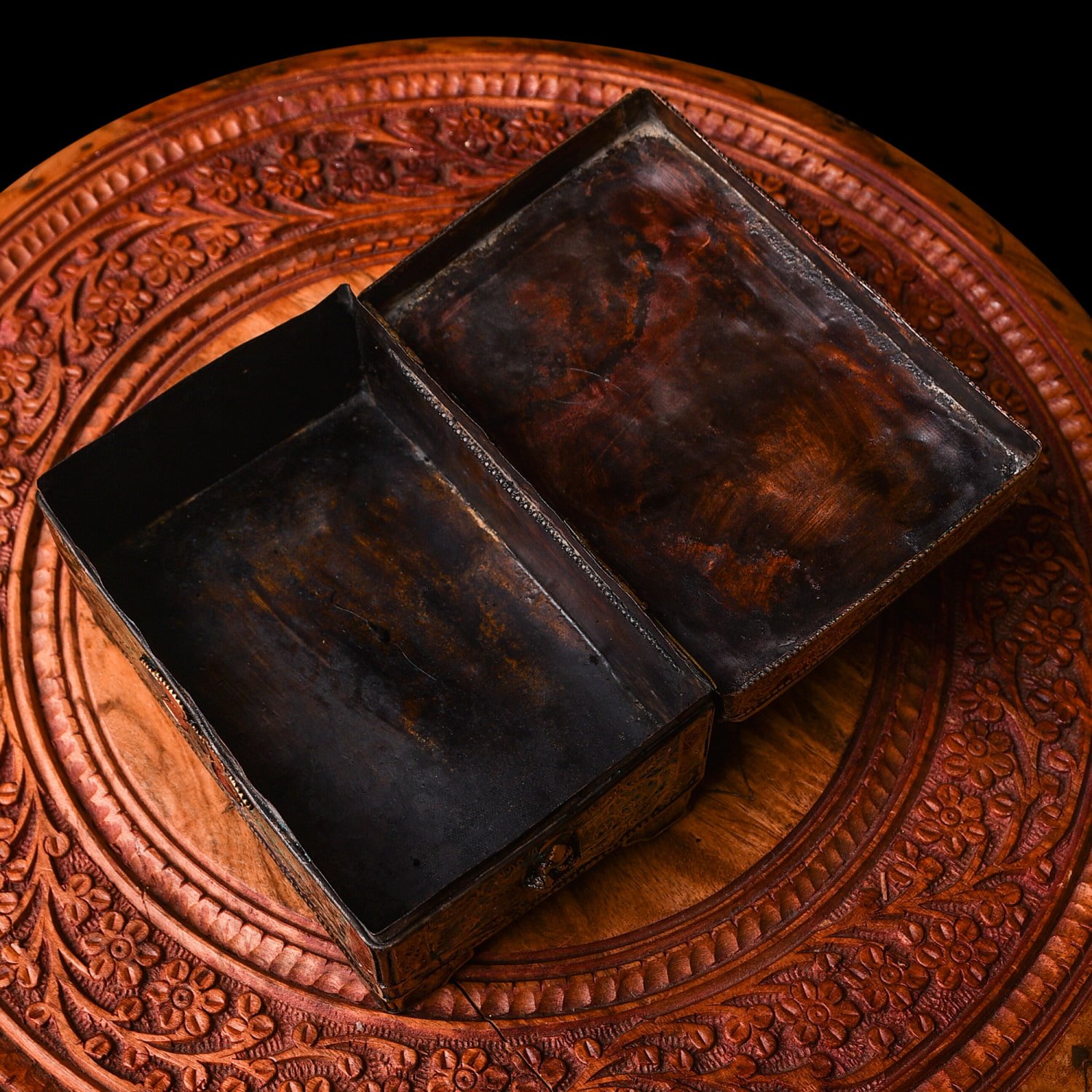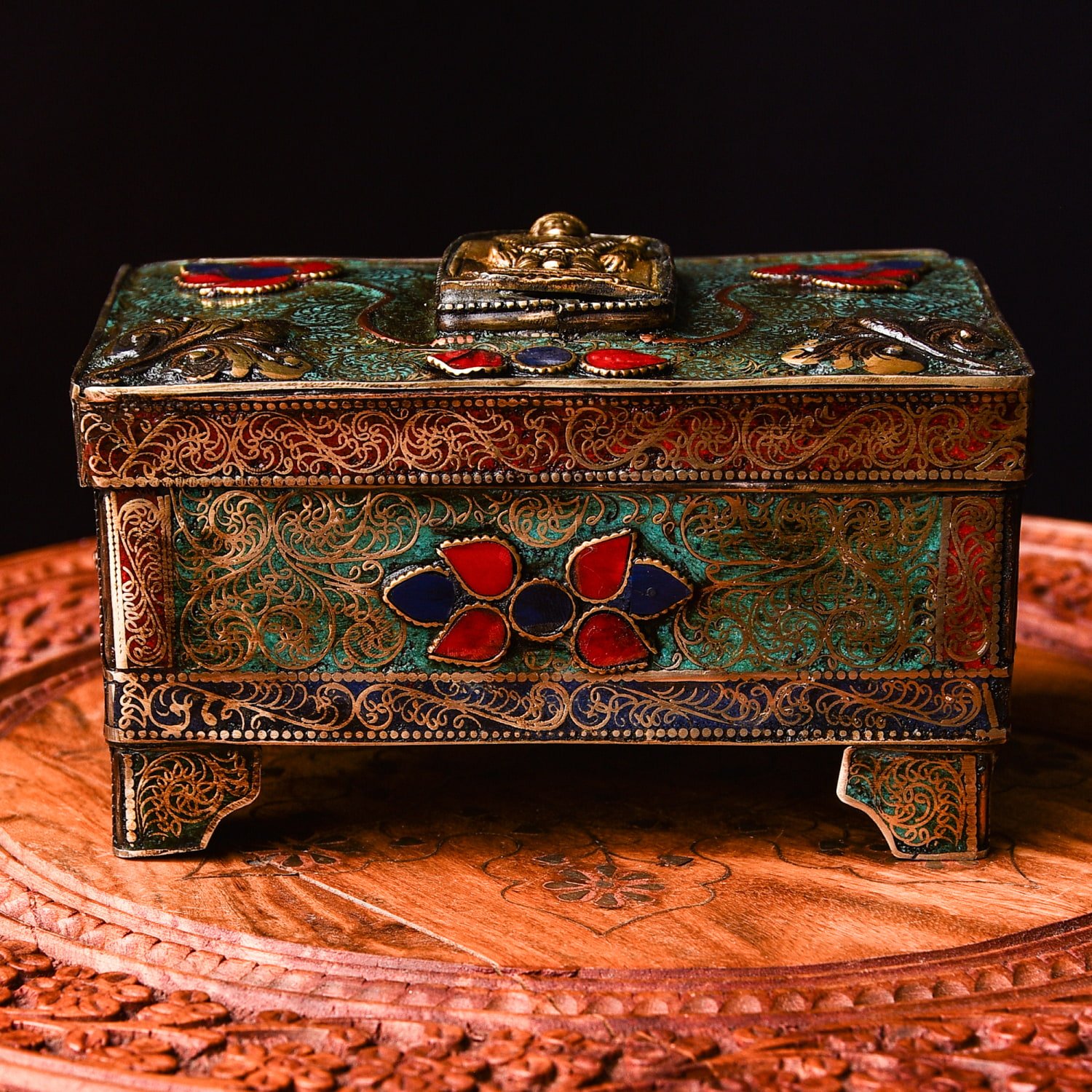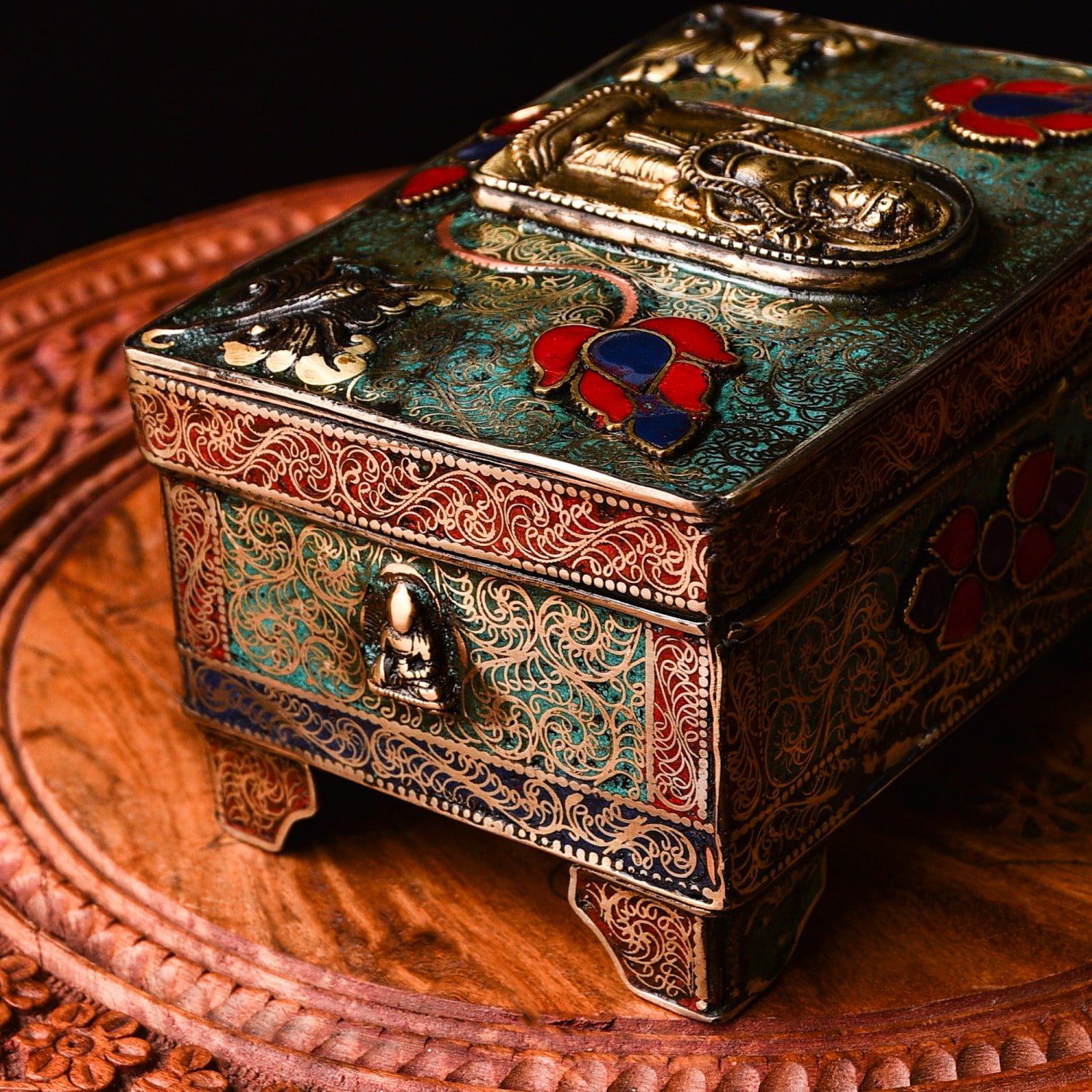 美しいチベタンターコイズと緻密極まりない金属細工によって大変綺麗に装飾されたチベタン・ジュエルケース。ケースに施された曲線の複雑な装飾はネパールならではの味を醸しだしています。小物いれとして丁度いいサイズですので、大切な指輪やアクセサリーなどをしまっておくときに便利ですね。
