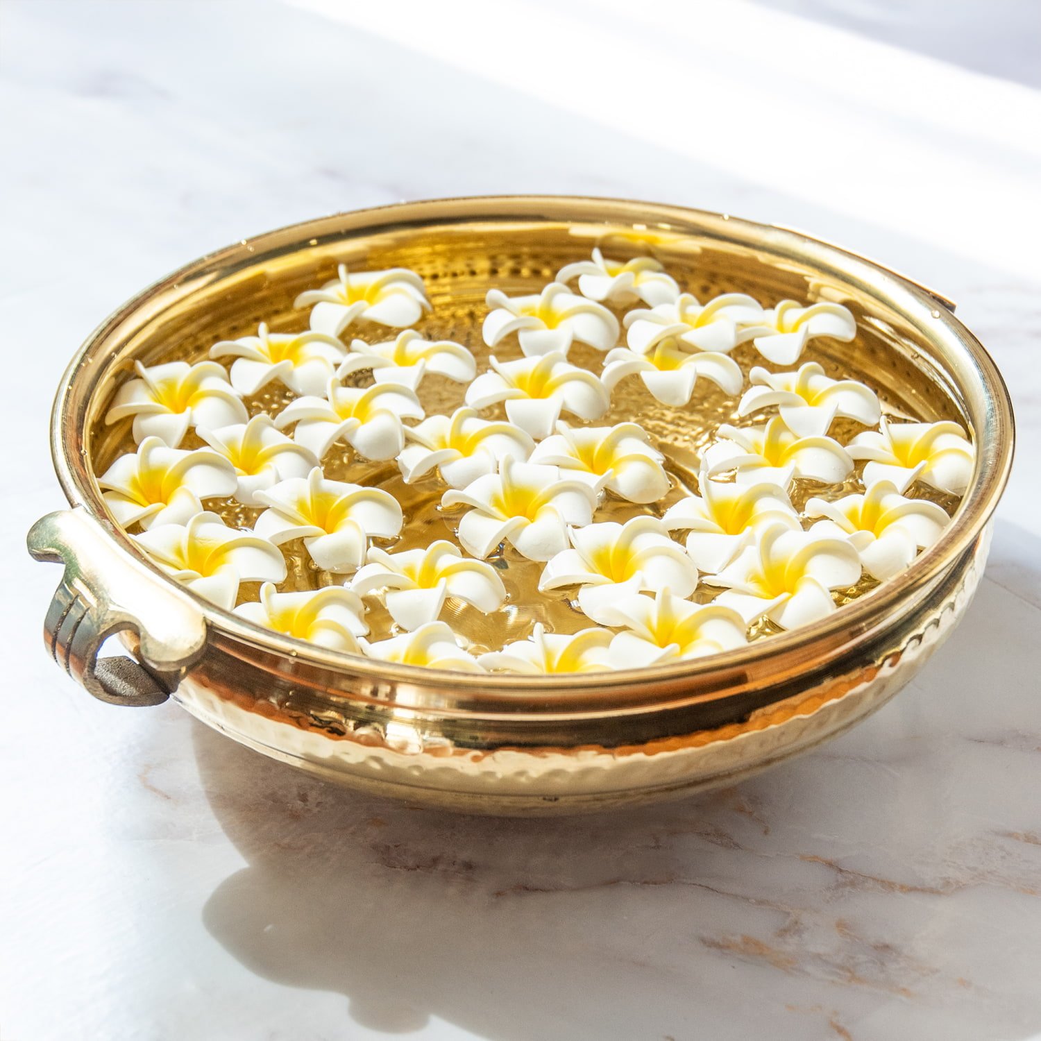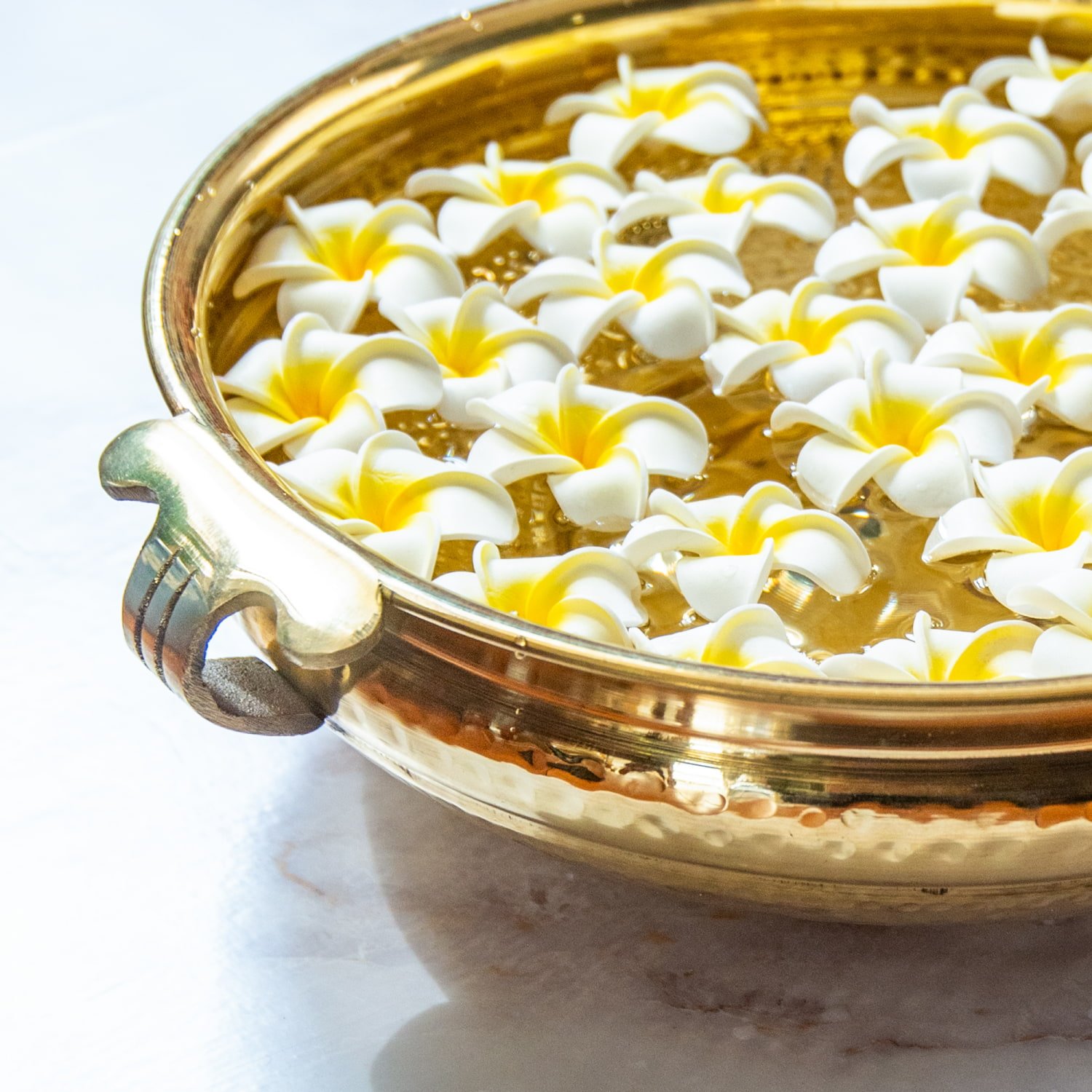 南インド・ケーララ州で古くから使われてきた伝統の器「ウルリ(Uruli)」。本来は青銅や真鍮で作られ、アーユルヴェーダの薬草を煎じたり、儀式の供物を調理したりする際に用いられてきました。その丸く開いた形は「豊かさと調和」を象徴し、寺院や家庭では吉祥の器として扱われています。現代では、ウルリは「癒しと浄化」の象徴として、玄関やリビング、スパ空間の装飾に用いられるようになっています。水を張って花びらを浮かべ、南インドの伝統的な迎え花“プーカラム”のように華やかな雰囲気を演出します。
