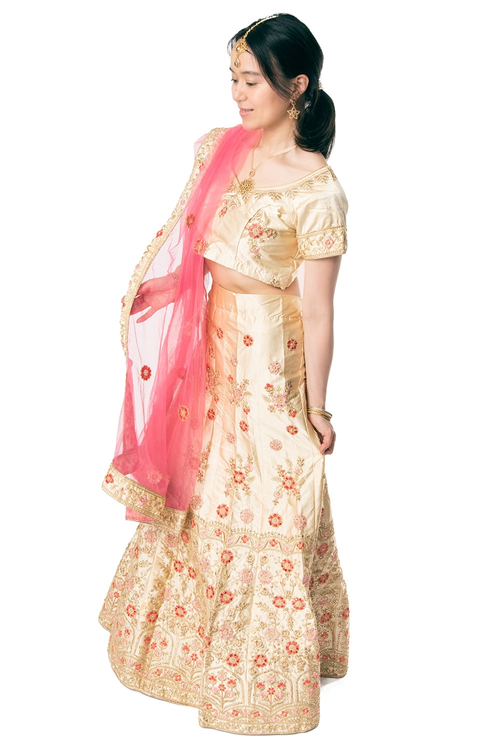 「レヘンガ」とは、シャツ(チョリ)とスカートの2ピースタイプのドレスの上に、ストールをサリーのように巻いたもの。 花嫁衣装としては、この「レヘンガ」を着用することが多くあります。インドの結婚式は一生に一度の晴れ舞台。 年収の4年分以上をつぎ込んで行うインド人の人生で一番大きなイベント。だから、そこでは何でも豪華絢爛。これでもか!!っていう位の豪華な衣装を着て、豪華な会場を作り、料理を大盤振る舞い。 ちょっと名の知れたカップルの結婚式ともなると、1000人以上の人たちが詰めかけます。 このレヘンガはそこで使われるインド人の花嫁衣裳。お金に糸目をつけないので本当に豪華絢爛!! まるでインドの王妃みたいなすごく素敵な衣装です。光沢の布に、細かい刺繍やビーズをを一本一本手で刺したりして作る、 全部ハンドメイドのウェディングドレスです。