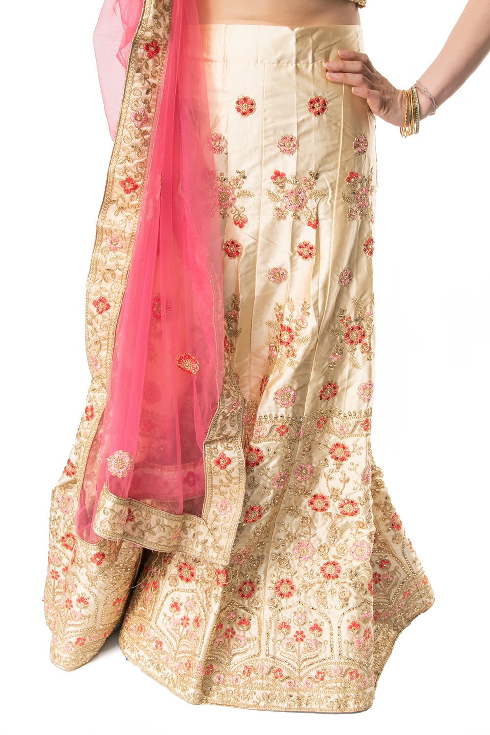 【1点物】インドのレヘンガドレスセット - ホワイト×ピンク