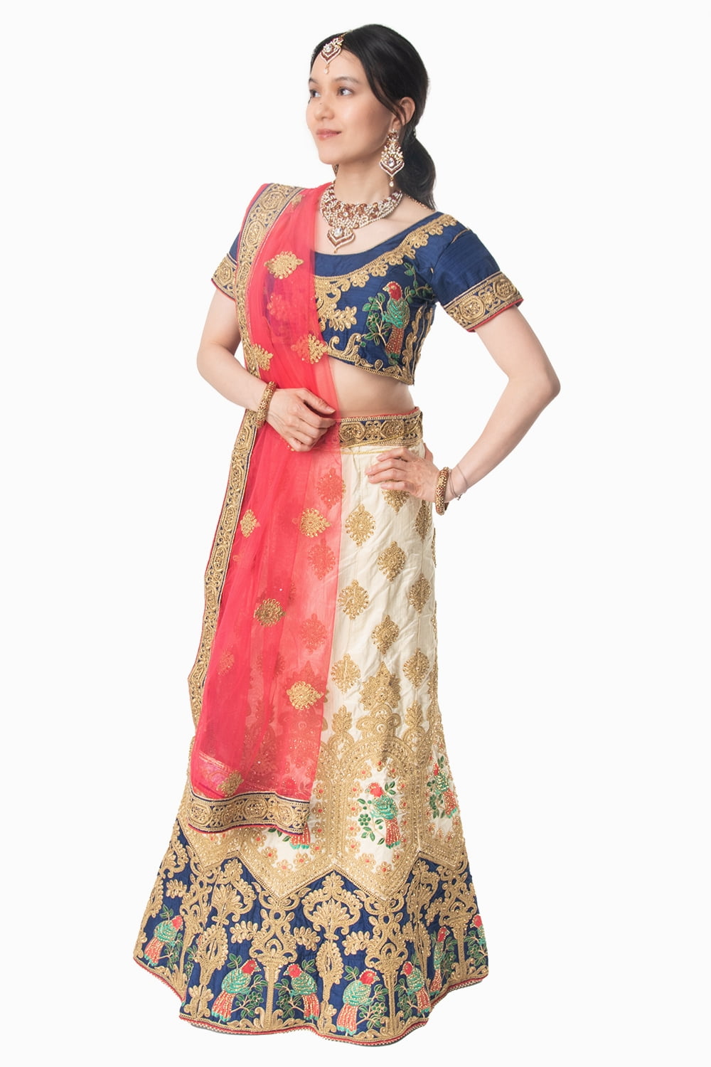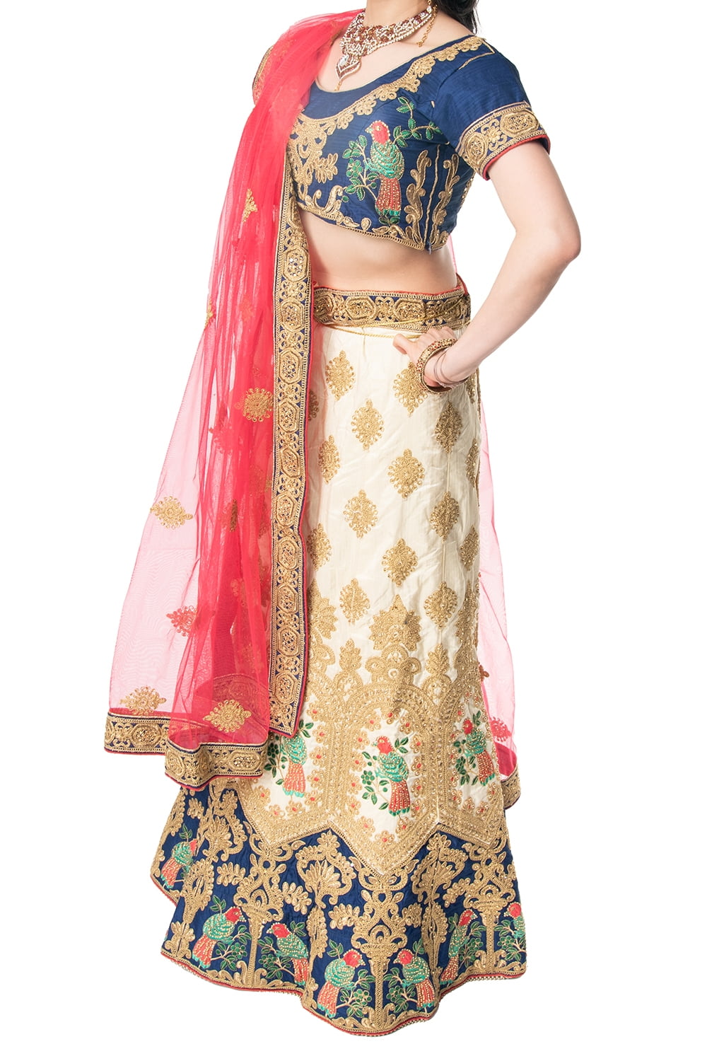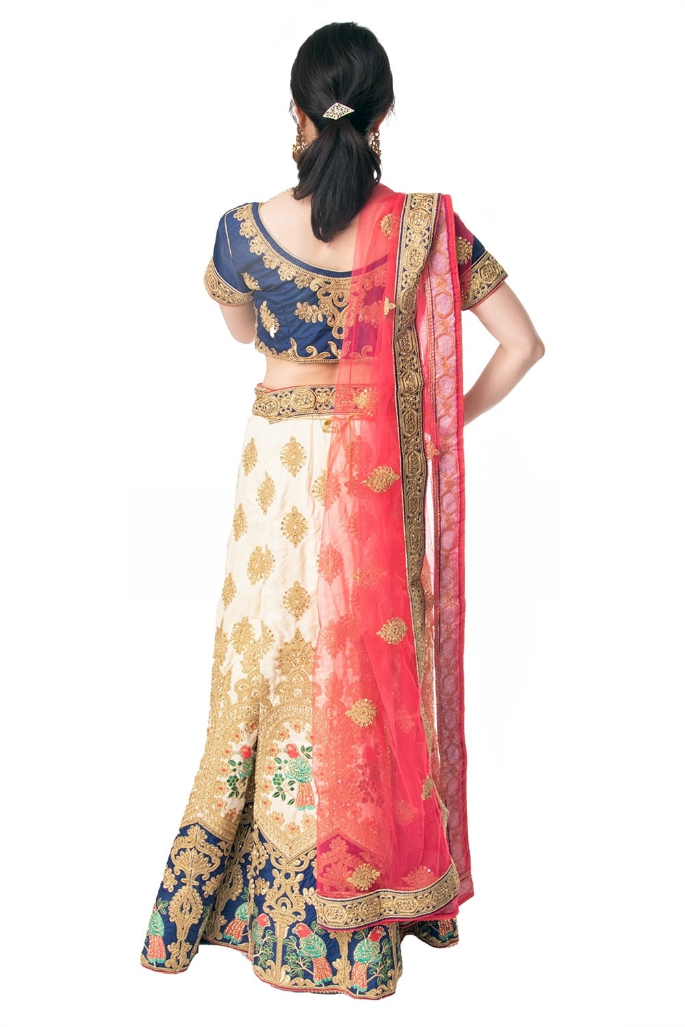 【1点物】インドのレヘンガドレスセット - ブルー×ホワイト