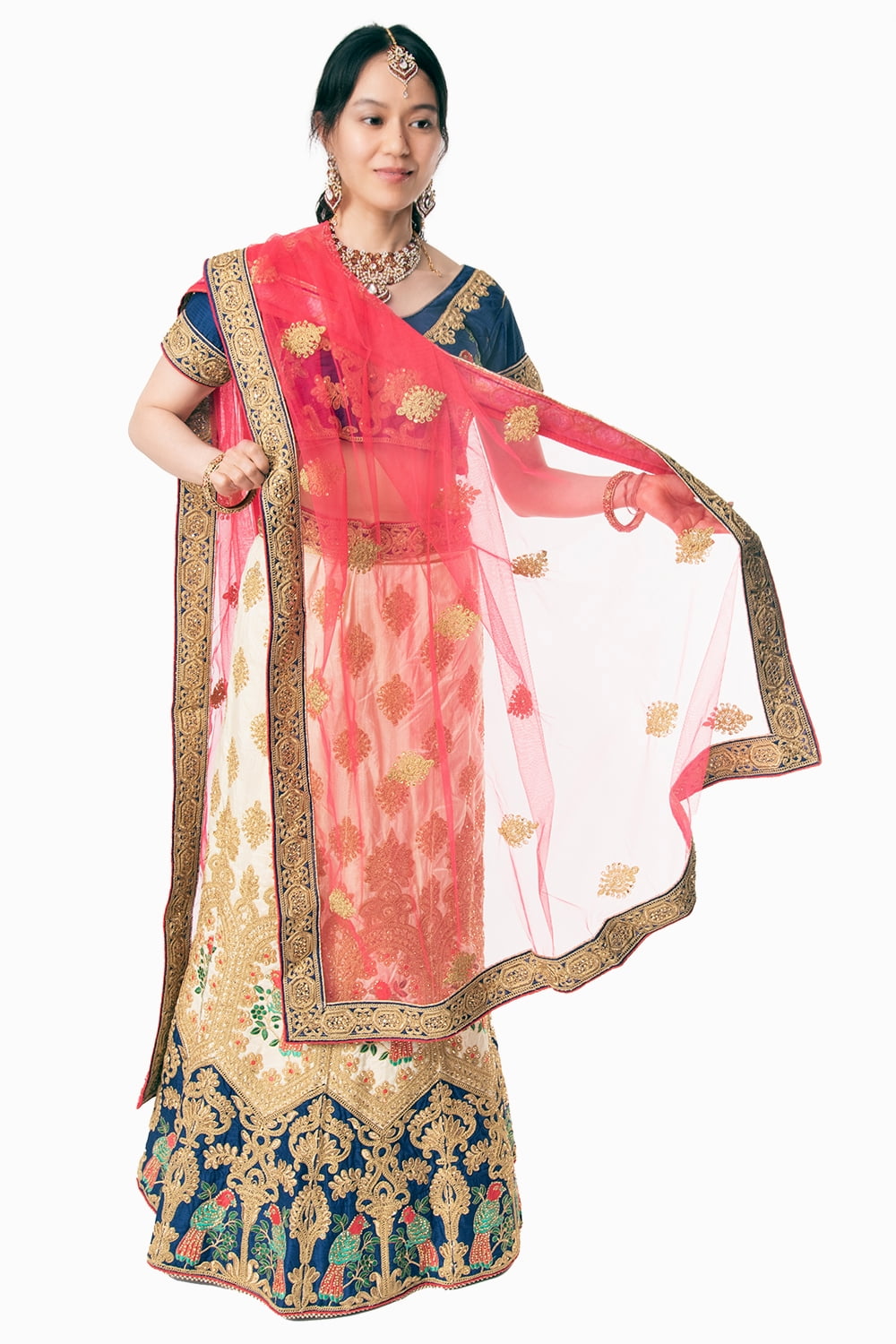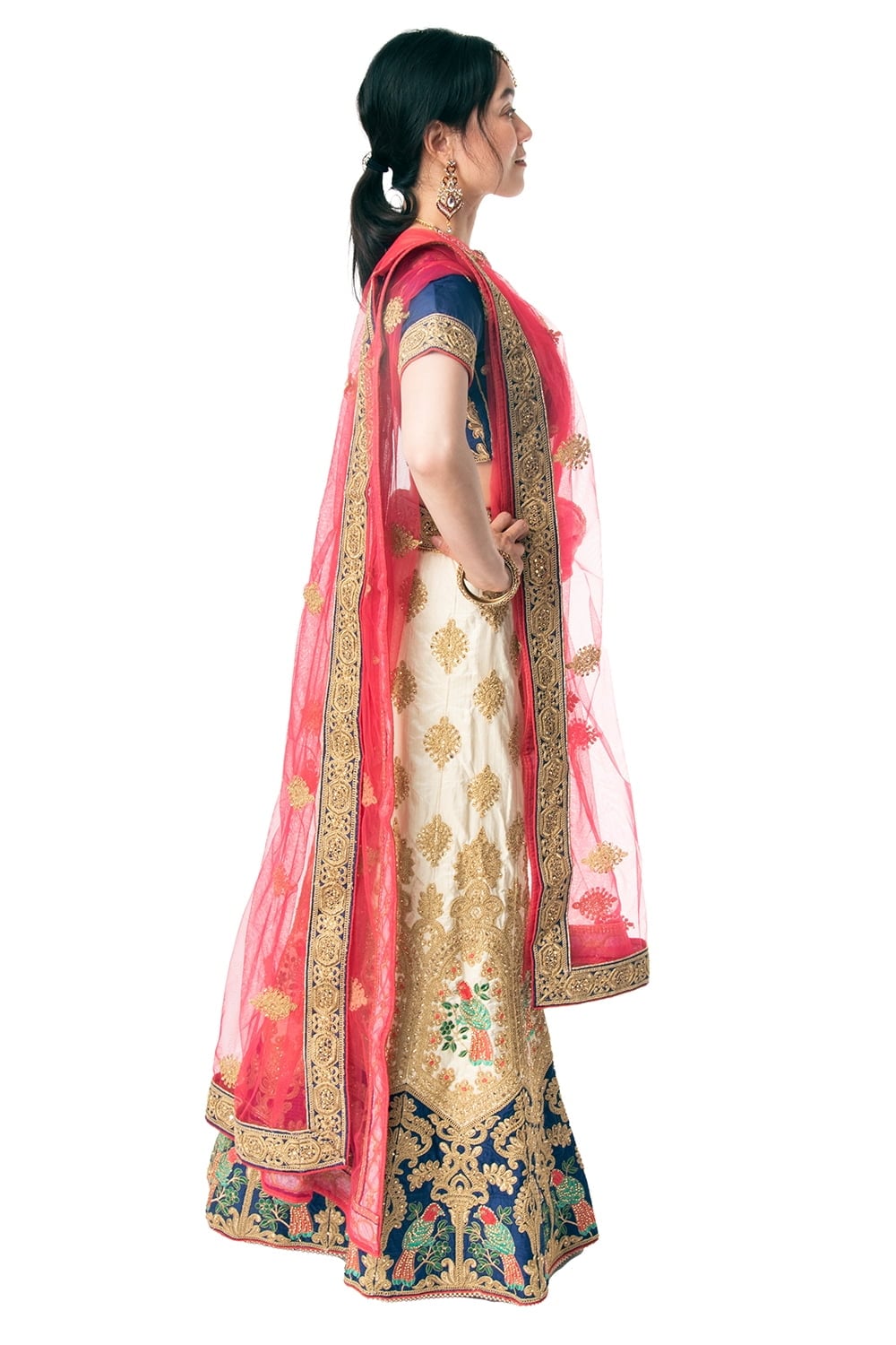 「レヘンガ」とは、シャツ(チョリ)とスカートの2ピースタイプのドレスの上に、ストールをサリーのように巻いたもの。 花嫁衣装としては、この「レヘンガ」を着用することが多くあります。インドの結婚式は一生に一度の晴れ舞台。 年収の4年分以上をつぎ込んで行うインド人の人生で一番大きなイベント。だから、そこでは何でも豪華絢爛。これでもか!!っていう位の豪華な衣装を着て、豪華な会場を作り、料理を大盤振る舞い。 ちょっと名の知れたカップルの結婚式ともなると、1000人以上の人たちが詰めかけます。 このレヘンガはそこで使われるインド人の花嫁衣裳。お金に糸目をつけないので本当に豪華絢爛!! まるでインドの王妃みたいなすごく素敵な衣装です。光沢の布に、細かい刺繍やビーズをを一本一本手で刺したりして作る、 全部ハンドメイドのウェディングドレスです。