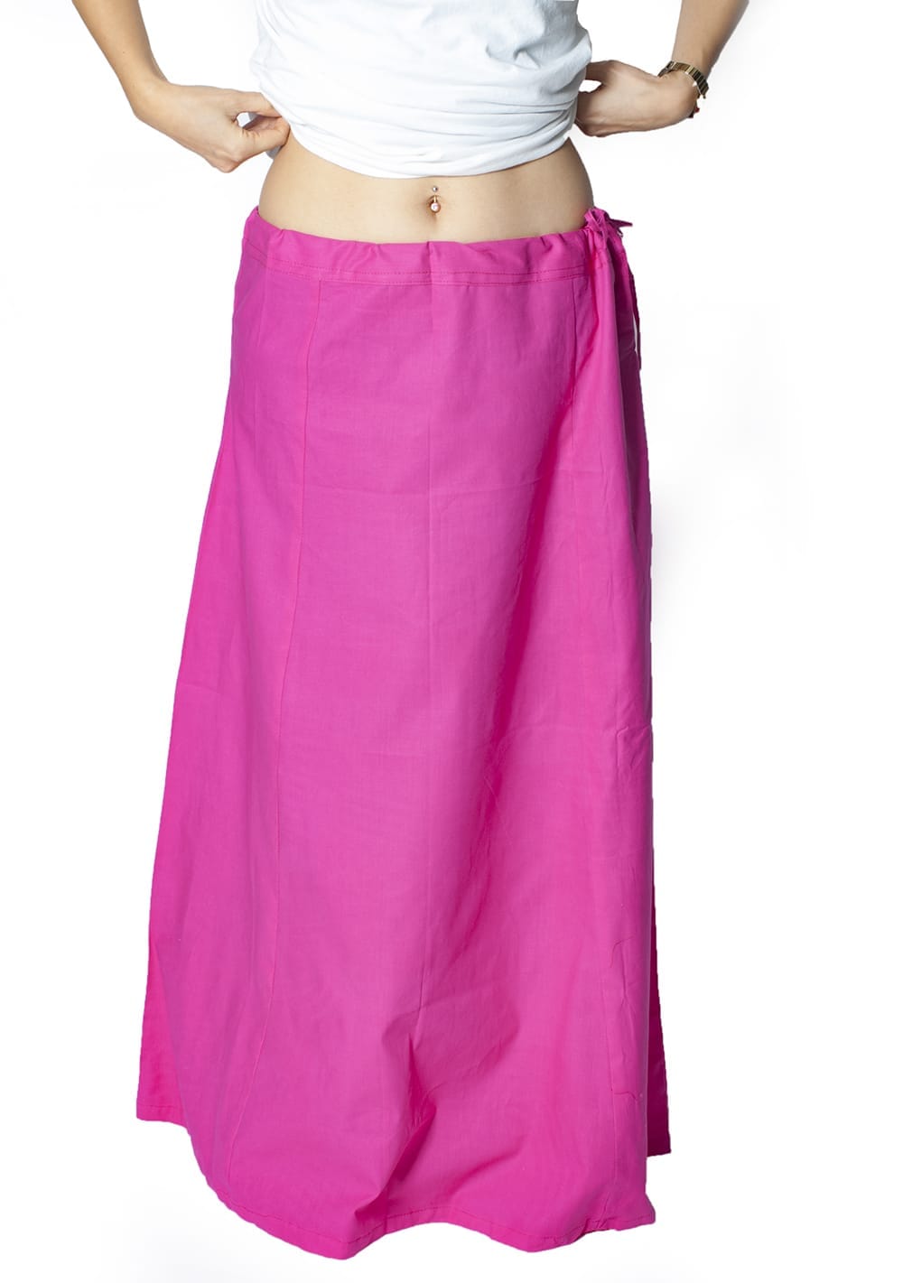 インドの民族衣装サリーを着用する際、インナーに着るスカート『ペチコート』コットンで作られた単色のスカートでシンプルそのものですが、このペチコートがないと、サリーを着始める際に布をたくし込んで止めておく場所がありませんので、うまく着ることができません。もちろん、このペチコートでなくてもスカートであれば役に立つと思いますが、やっぱり本場のペチコートは使い勝手がひと味違うと思います。お値段的にも手頃ですので、サリーを上手に着たい方はぜひサリーと一緒にお求めください。