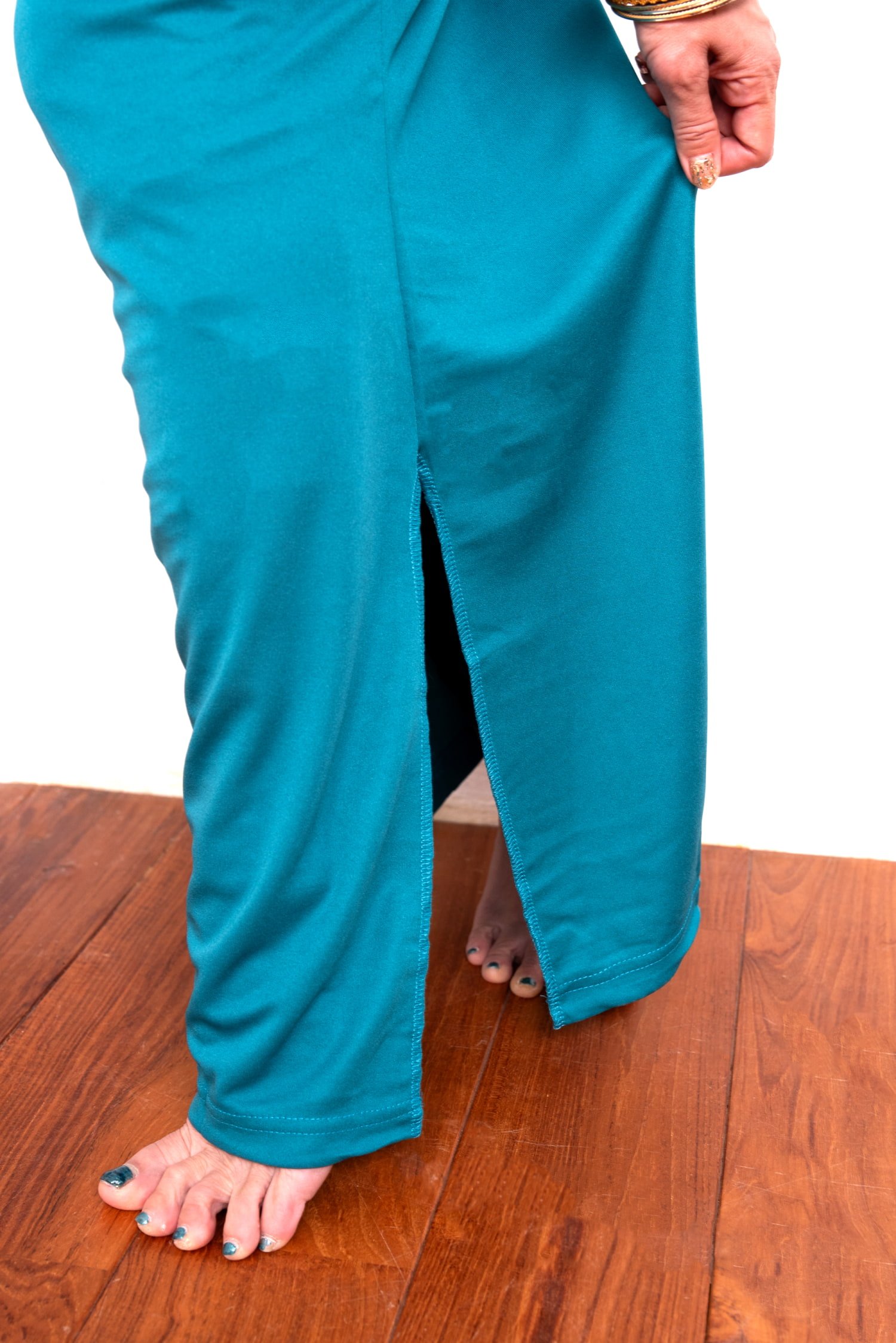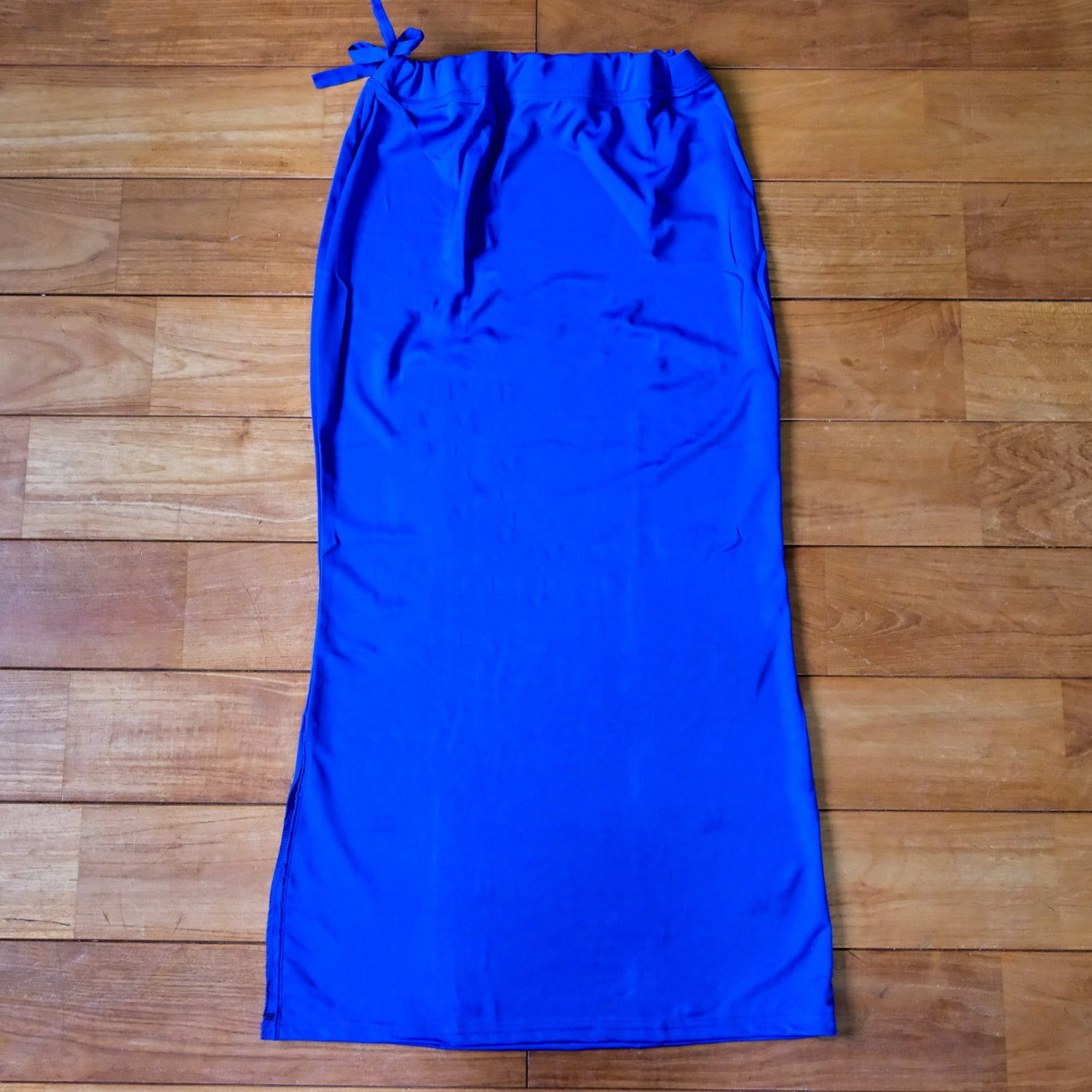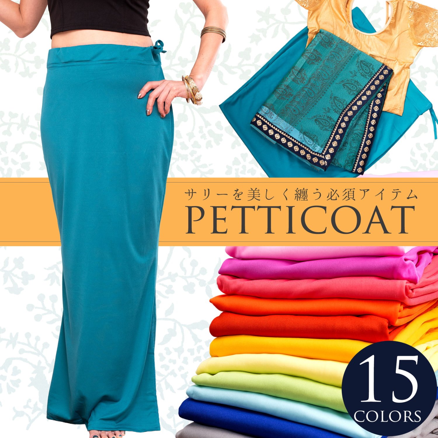 インドの民族衣装サリーを着用する際、インナーに着るスカート『ペチコート』です。ストレッチ素材で作られた単色のスカートでシンプルそのものですが、このペチコートがないと、サリーを着始める際に布をたくし込んで止めておく場所がありませんので、うまく着ることができません。それならレギンスでも良くない?と思って聞いてみたのですが、やはりパンツタイプだとシルエットが美しく出ないそう。歩いたり、風に当たったときに形が崩れやすいので、やはりこの長さのペチコートが一番!とのことです。従来のコットン素材がさらに進化して体にフィット、ストレッチ素材なのでフィットしても窮屈でなく気持ちよく履けます。お値段的にも手頃ですので、サリーを上手に着たい方はぜひサリーと一緒にお求めください。