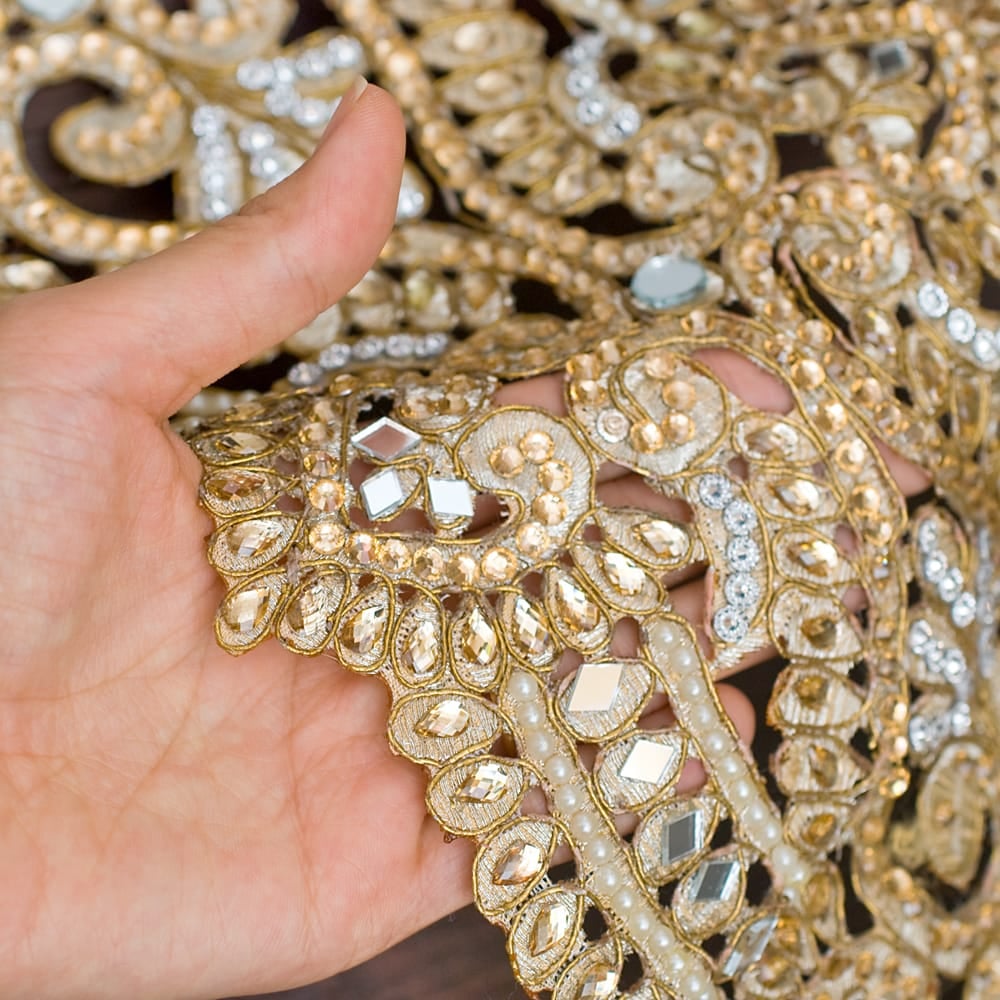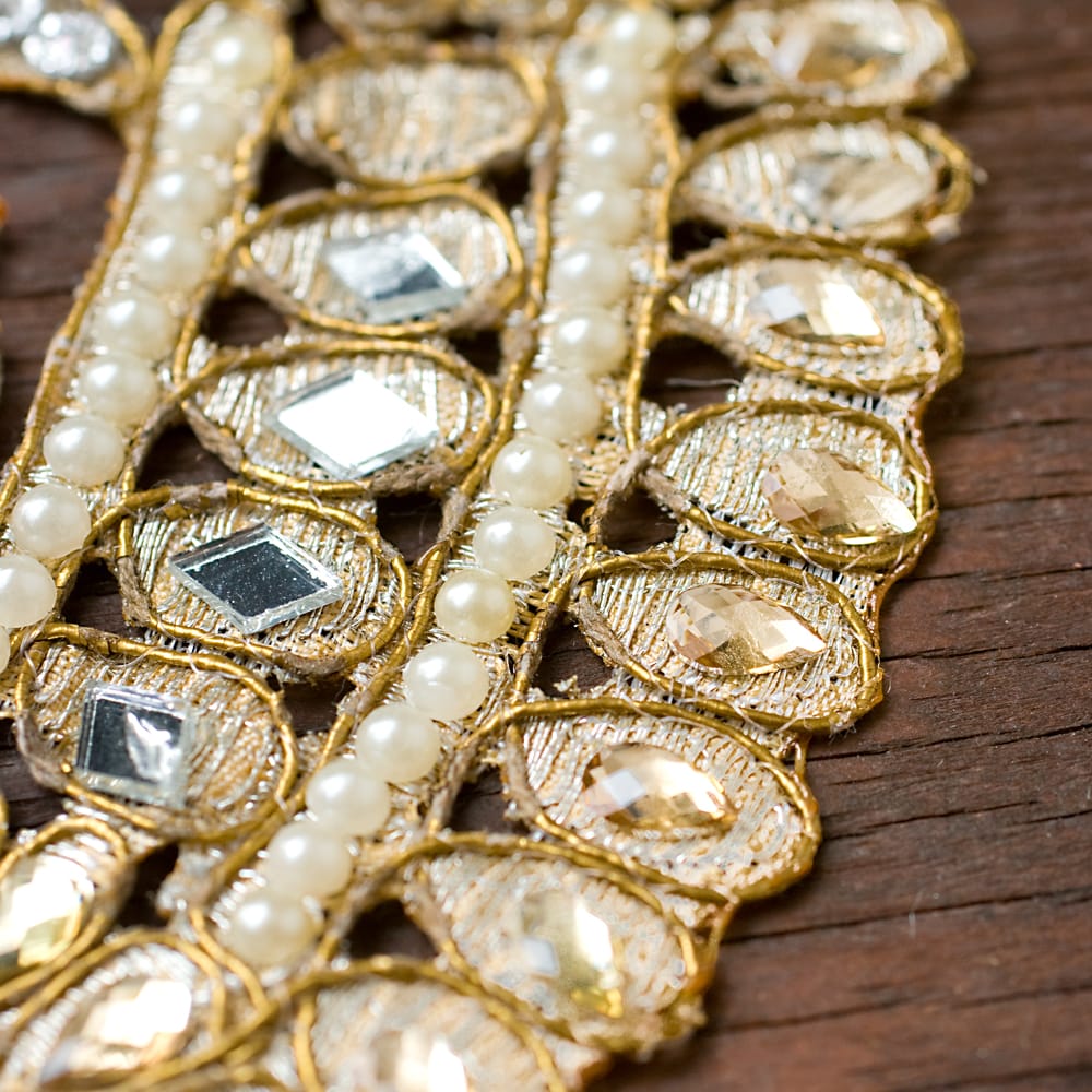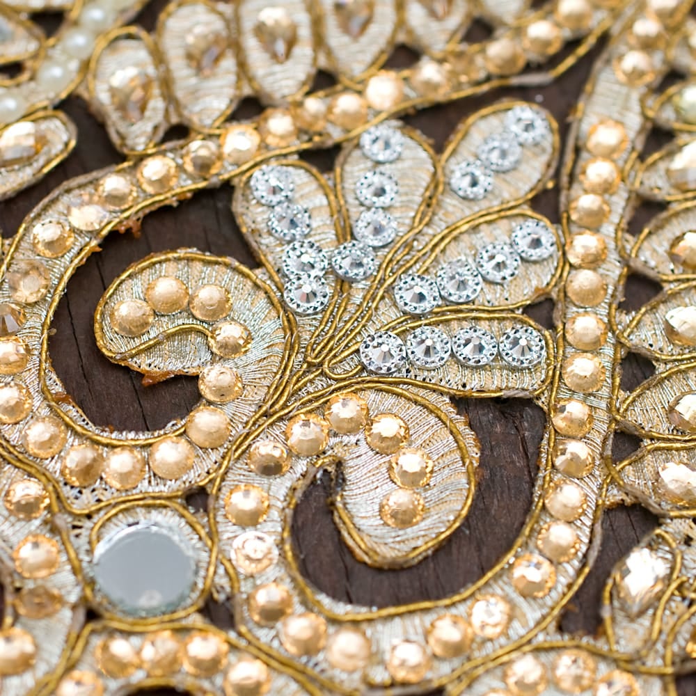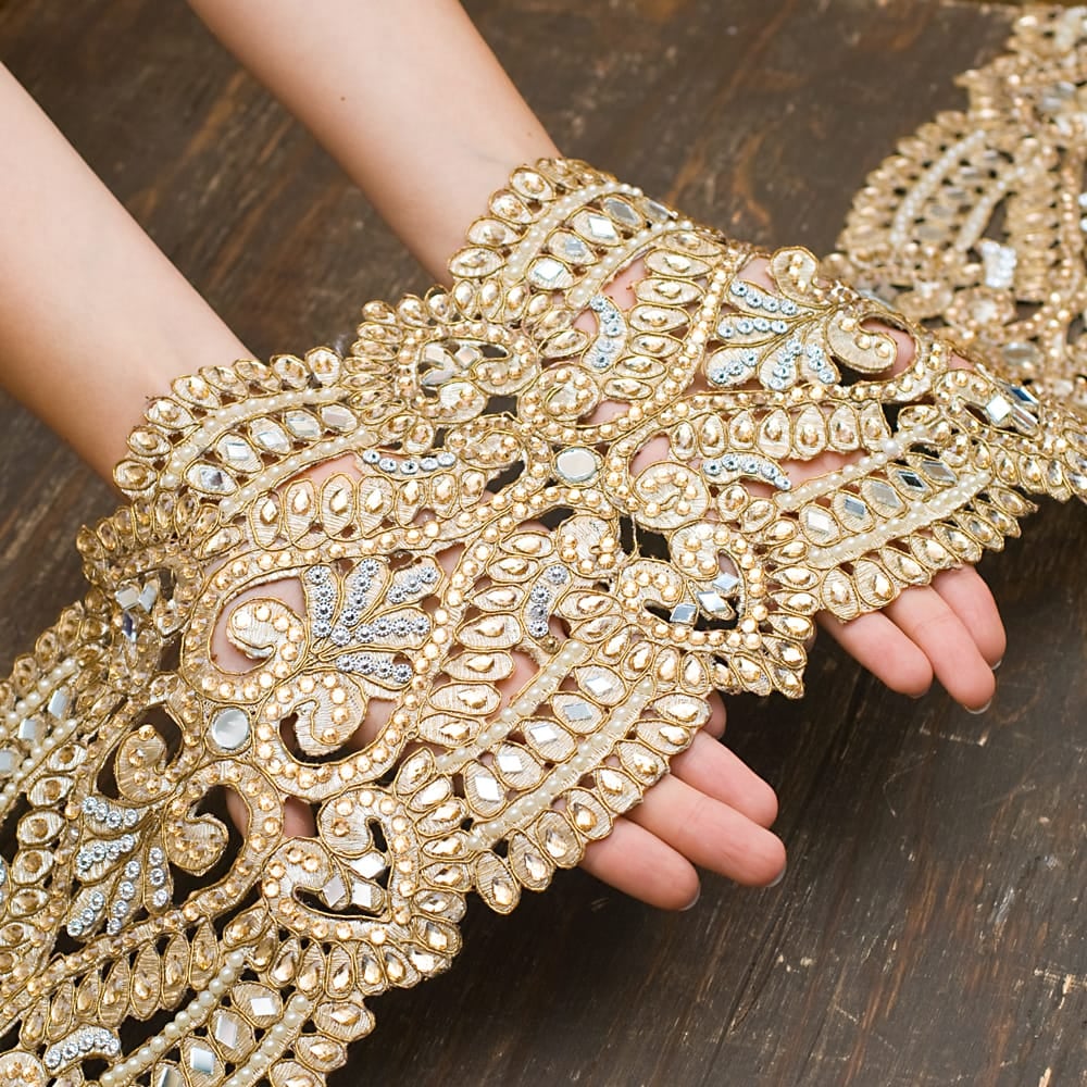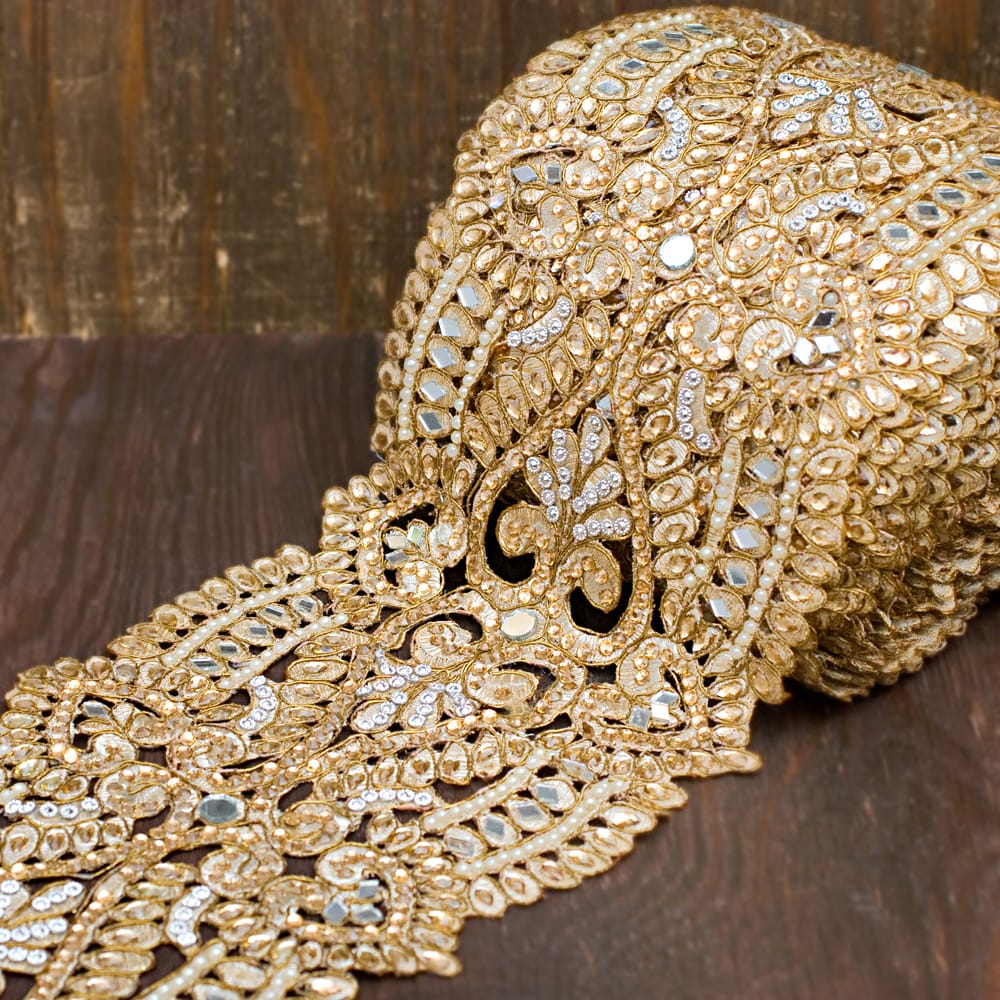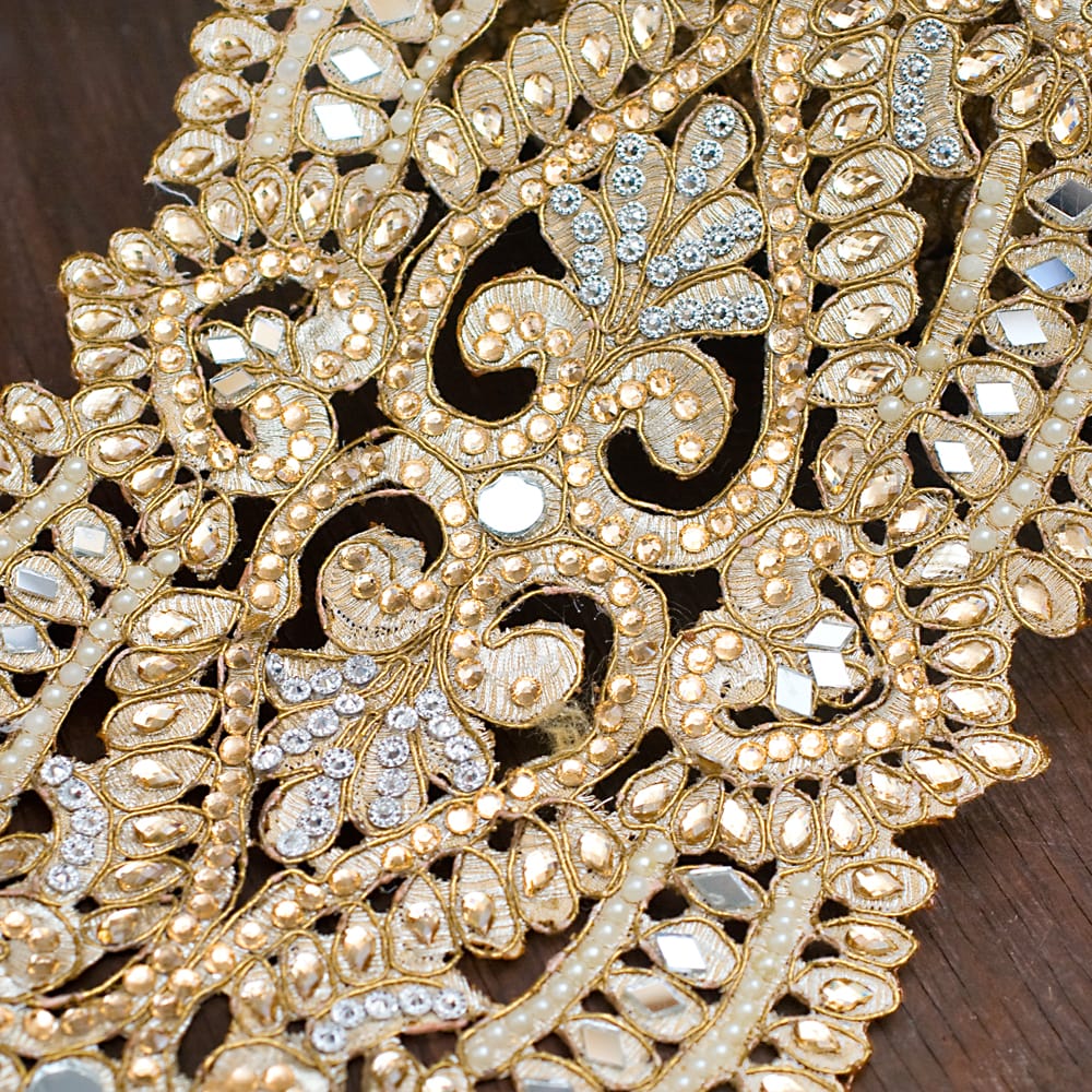こちらのチロリアンテープはインドでは結婚式のサリーや装飾などにも使用される特別なテープです。贅沢にストーンやパールを使用したテープは、大変美しく、この上なく上品です。