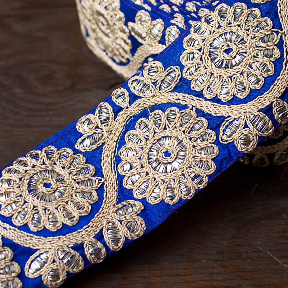 金糸花草柄チロリアンテープ (メーター売り・幅 約8cm) - 青