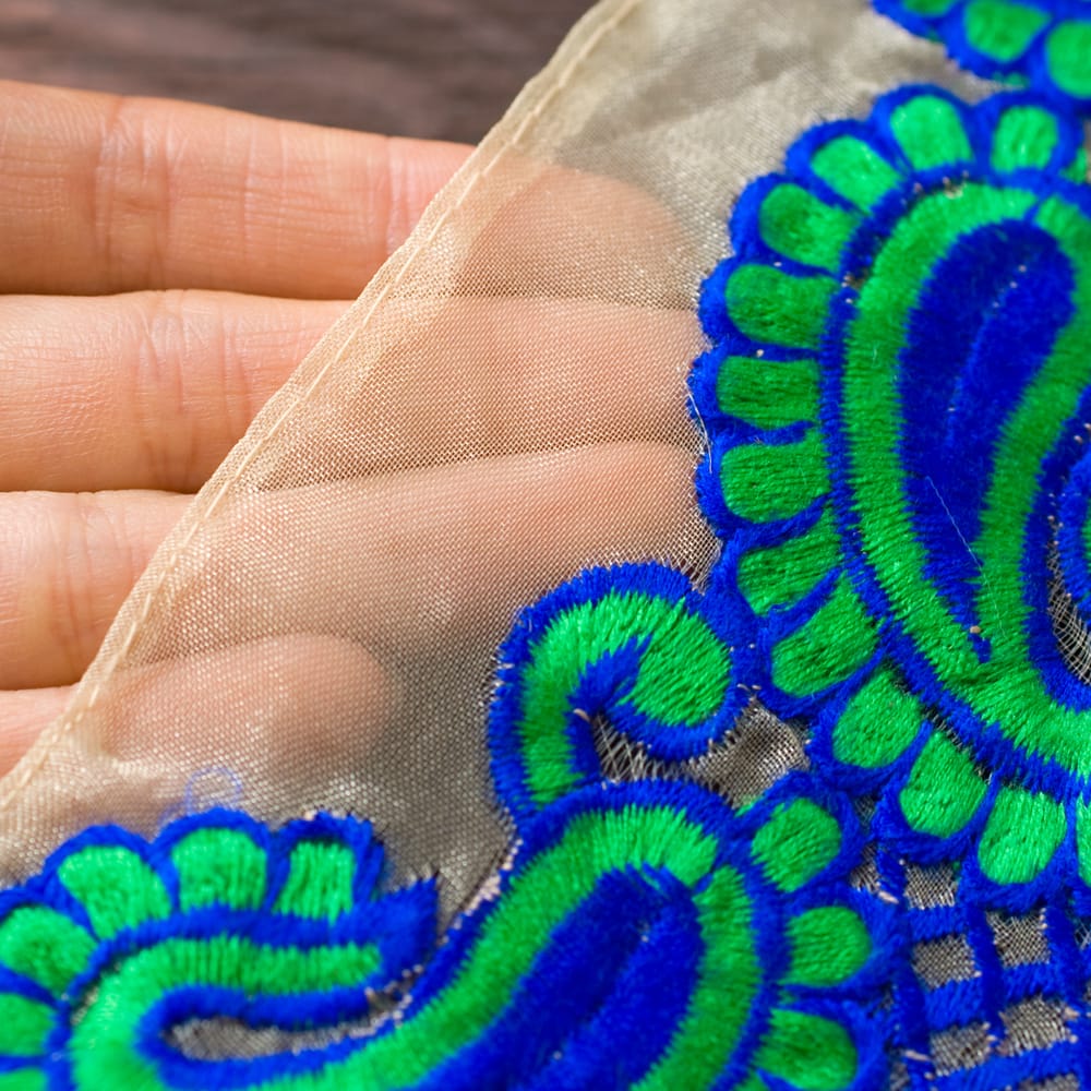インド人はサリーのすそがボロボロにならないよう、サリーがより綺麗に見えるようにサリーの下の部分、地面に当たる部分に縫い付けて使います。「チロリアン」とはもともとヨーロッパの地方名に由来しているのですが、インドではサリーを飾るために特に独自の発展を遂げてきました。■カラフルな刺繍が美しい