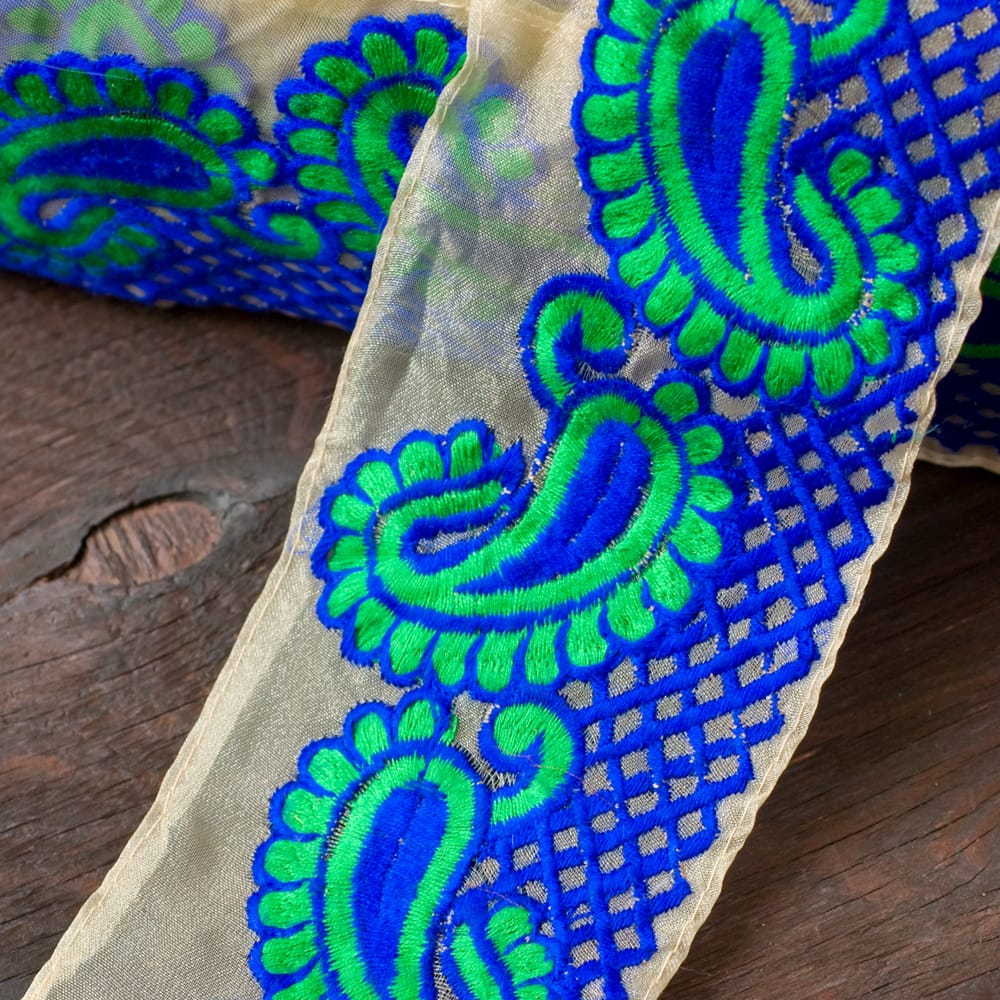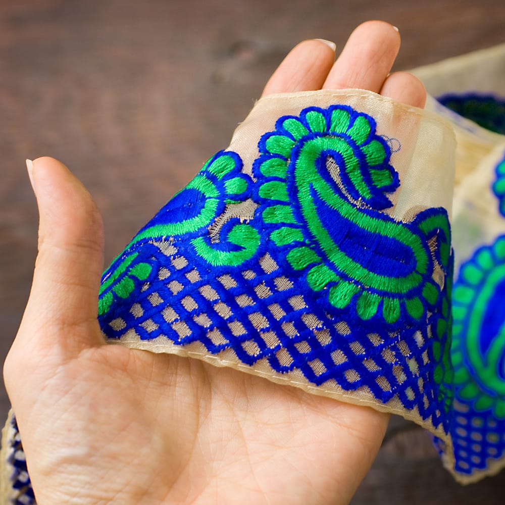 透け素材ペイズリー柄チロリアンテープ(メーター売り・幅約8cm) - ブルー 通販店