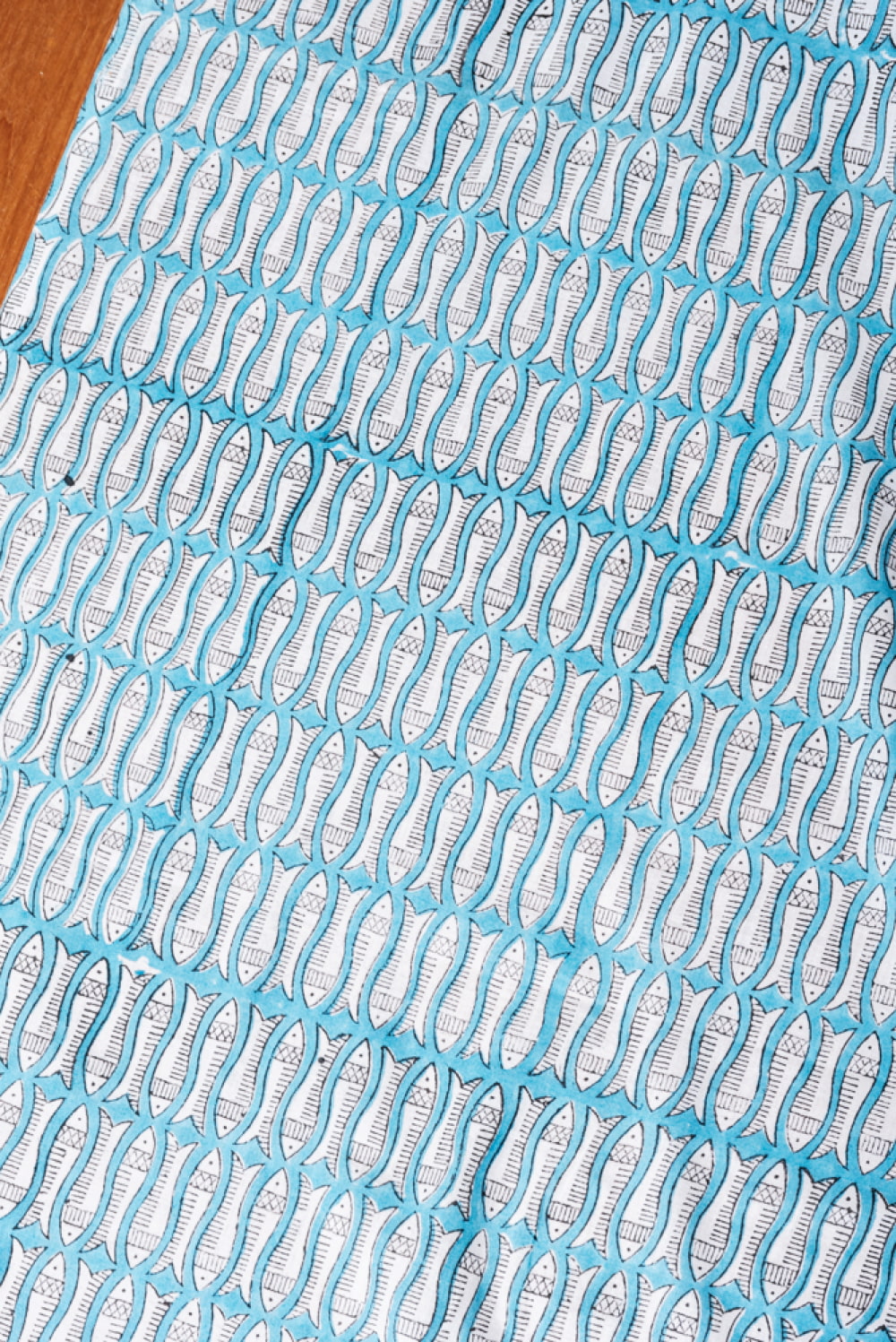 〔1m単位切り売り〕ジャイプル 職人手作り木版染め 色彩美しいボタニカルデザイン おしゃれ 生地 花柄 テーブルクロス 刺繍素材などへ お魚 フィッシュ柄 魚群〔幅約109cm〕 - ブルー系の商品写真 5枚目 生地の拡大写真です