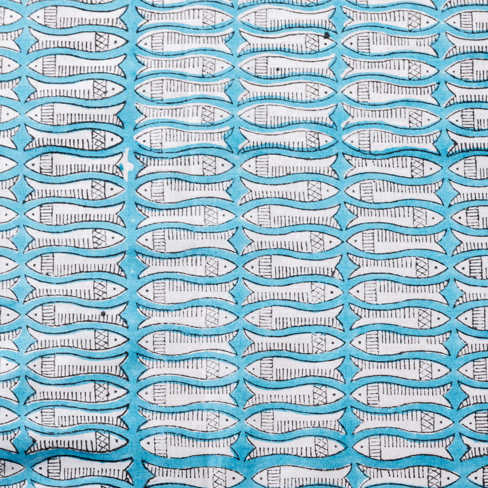 〔1m単位切り売り〕ジャイプル 職人手作り木版染め 色彩美しいボタニカルデザイン おしゃれ 生地 花柄 テーブルクロス 刺繍素材などへ お魚 フィッシュ柄 魚群〔幅約109cm〕 - ブルー系