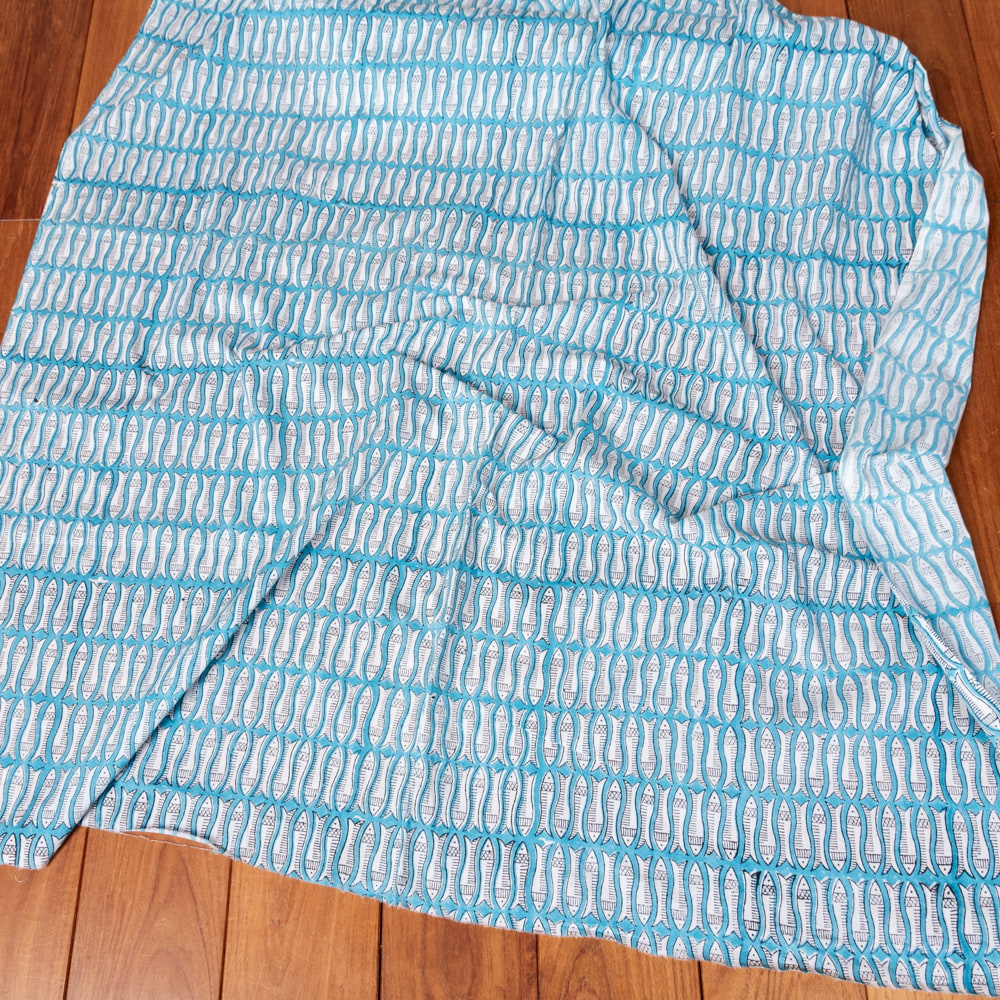 〔1m単位切り売り〕ジャイプル 職人手作り木版染め 色彩美しいボタニカルデザイン おしゃれ 生地 花柄 テーブルクロス 刺繍素材などへ お魚 フィッシュ柄 魚群〔幅約109cm〕 - ブルー系の商品写真 2枚目 生地を広げてみたところです。横幅もしっかりあります。注文個数に応じた長さにカットしてお送りいたします。