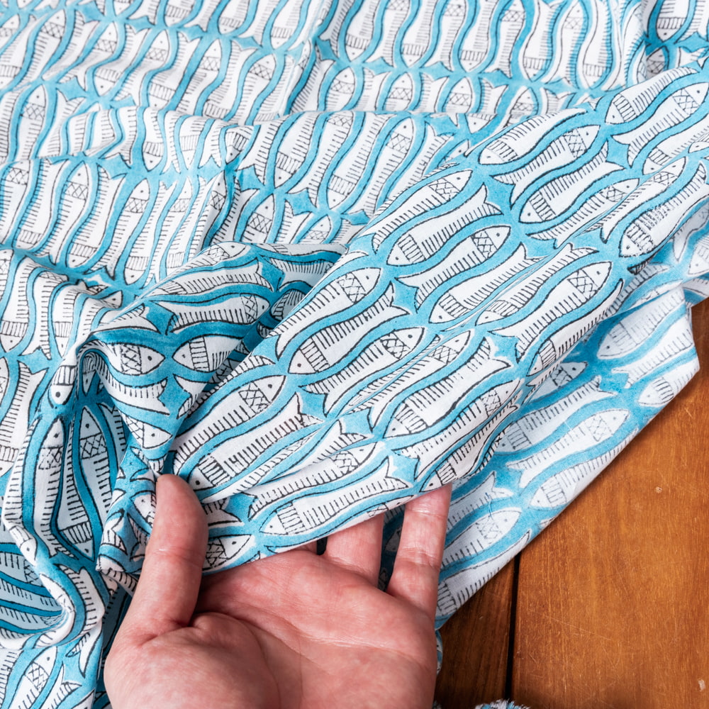 〔1m単位切り売り〕ジャイプル 職人手作り木版染め 色彩美しいボタニカルデザイン おしゃれ 生地 花柄 テーブルクロス 刺繍素材などへ お魚 フィッシュ柄 魚群〔幅約109cm〕 - ブルー系4枚目の説明写真です