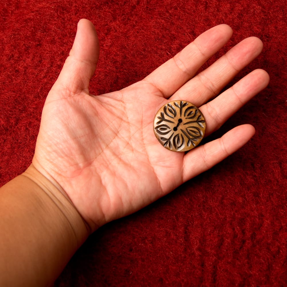 ネパールの人たちが水牛の角を使い、模様を手で彫った手作りのボタンです。ひとつひとつ手作りのため、よく見ると若干模様が異なったり、線の太さが違ったりしますが、それもまた手作りならではの温かさです。■服や鞄につけて