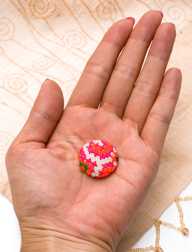 タイの山岳民族のひとつ、モン族の人達が一針一針手作りしたボタンです。モン族の女性たちは昔から、独特なアップリケや刺繍に願いを込めて、伝承の手段のひとつとして表現しています。独特の色の組み合わせや色合いがとても美しいです。ビビッドなカラーの組み合わせは日本では有りそうでない色合いで、エスニックな雰囲気が伝わってきます。まあるいコロンとしたデザインも温かい印象で、より一層可愛らしく見えます。■どんなものもオリジナルでエスニックな雰囲気に