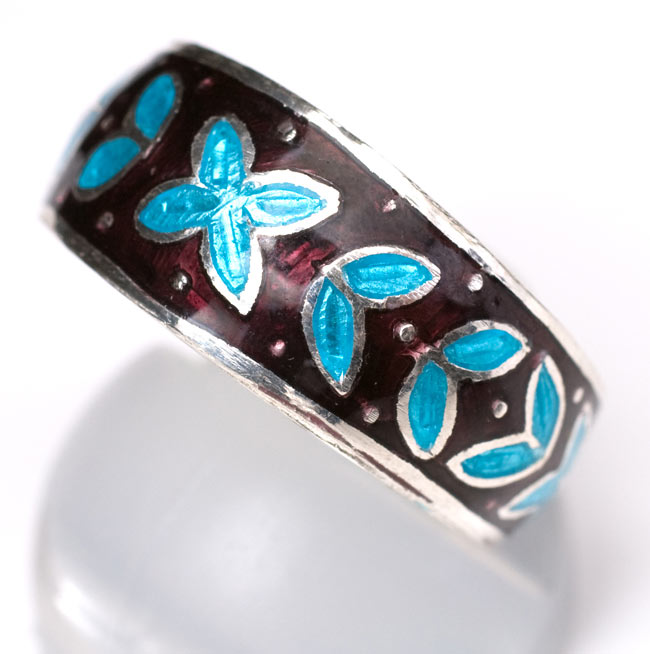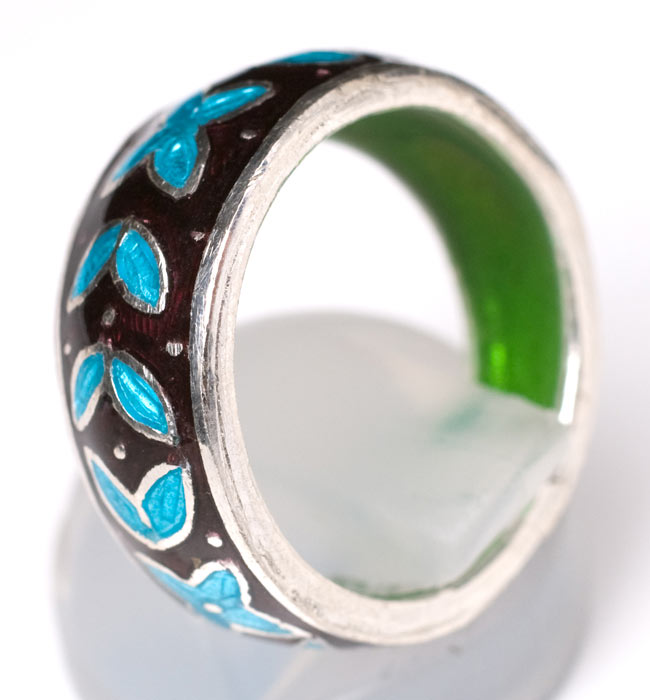 タージマハルで知られるムガル帝国の流れをひいた、銀と七宝が美しいシルバーリングです。インドのジャイプルは昔から宝石の町として知られており、安価な宝石から、高級品まで幅広く揃える事ができます。