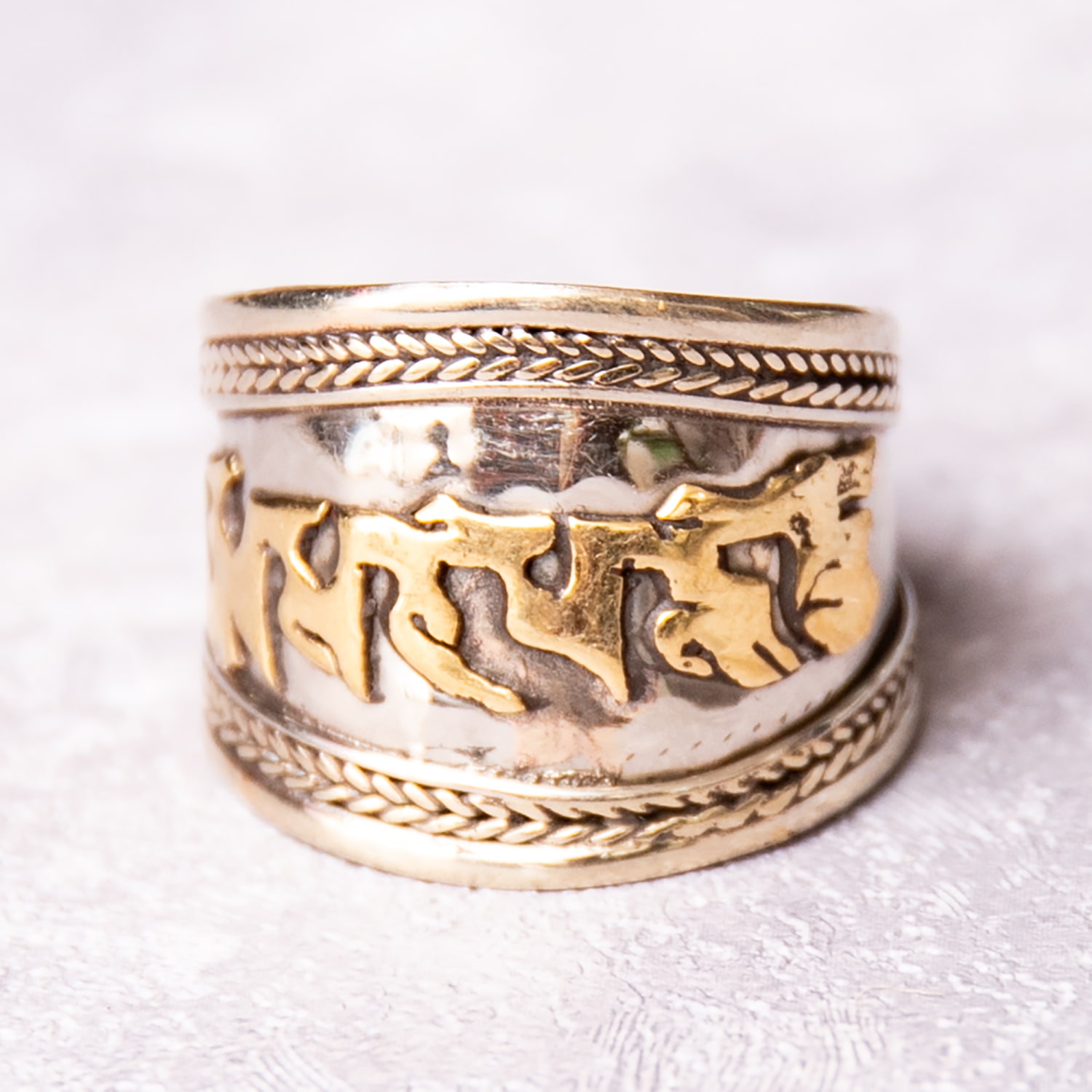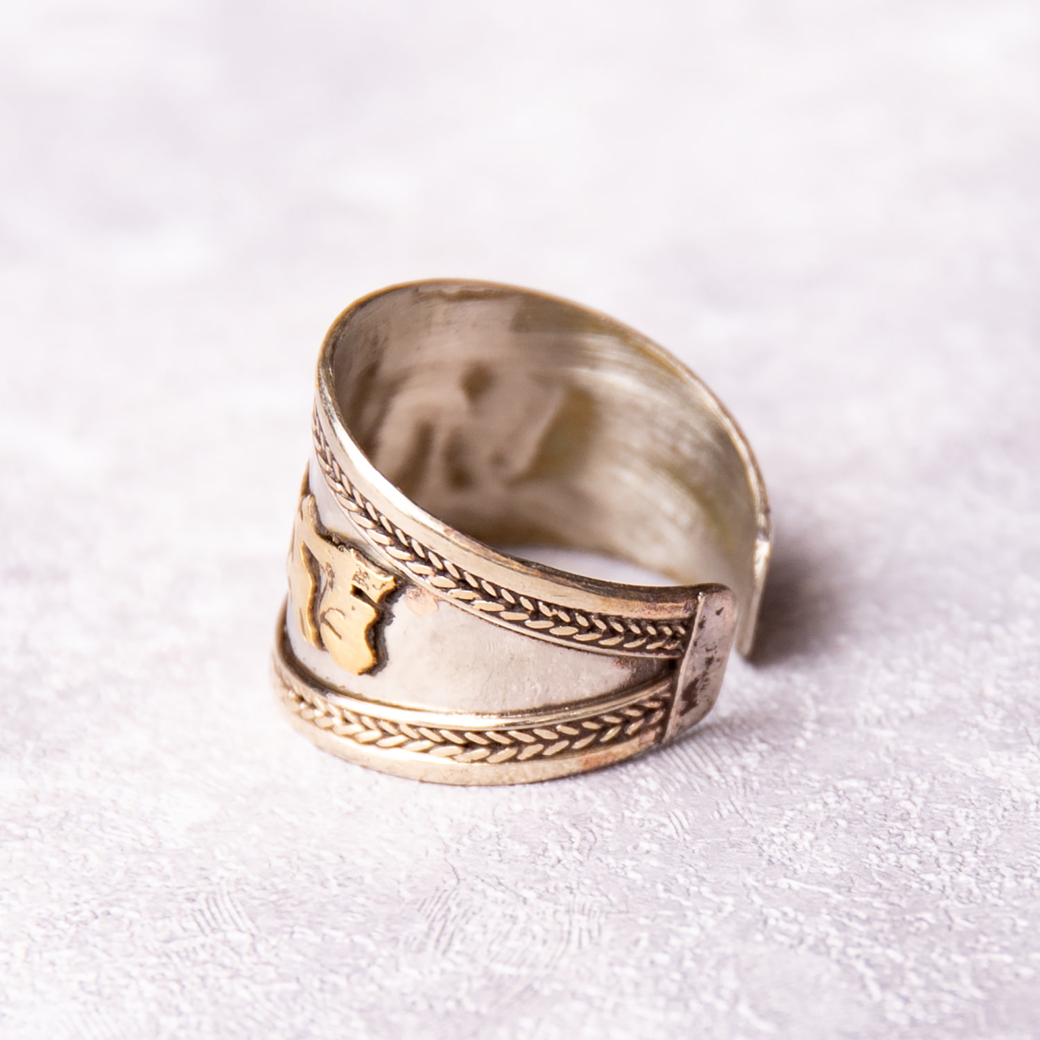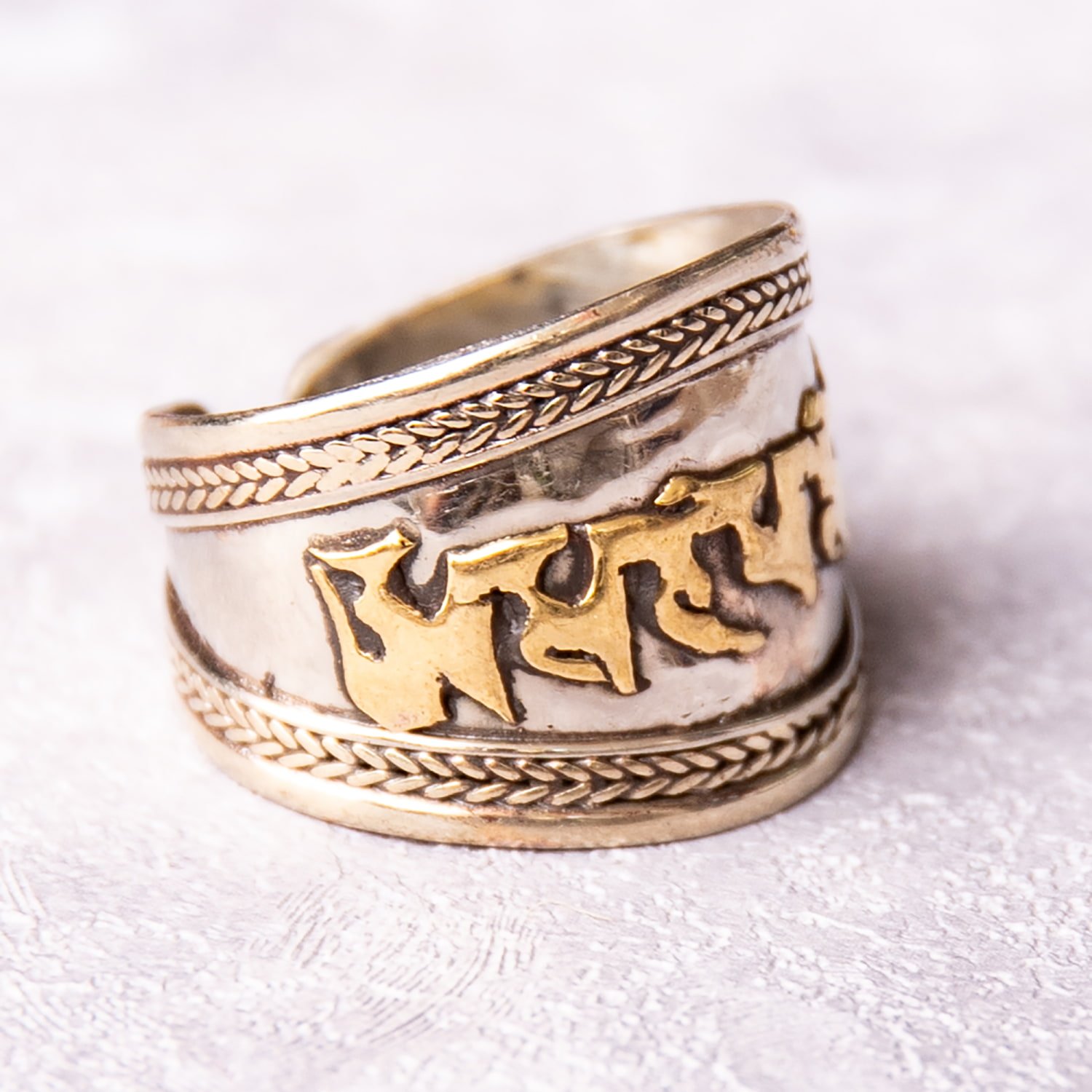 「オンマニペメフム」の装飾が施されたメタルリングです。あまり派手過ぎず厳かな印象を持っているので色んなシーンで身につけることができます