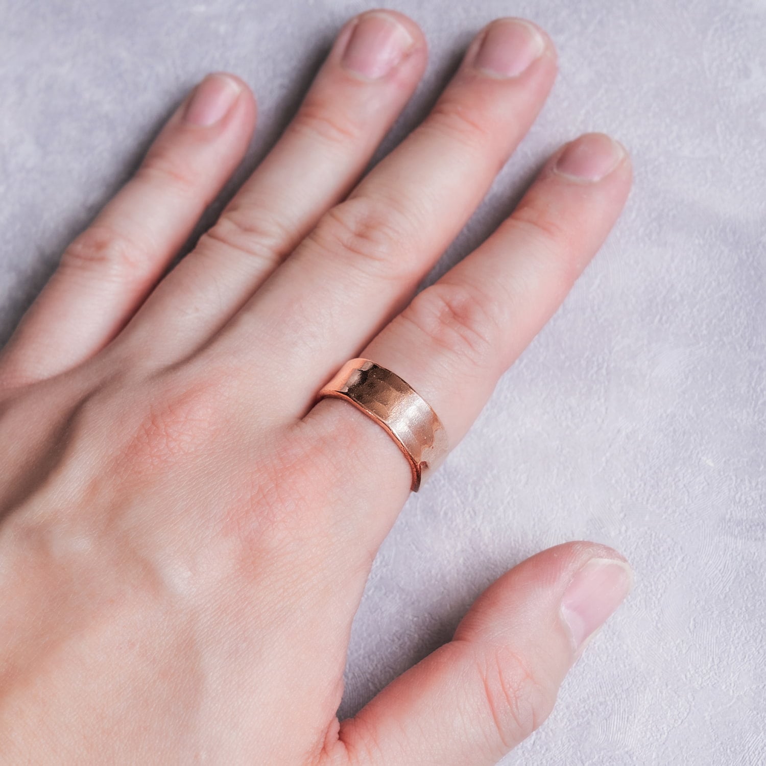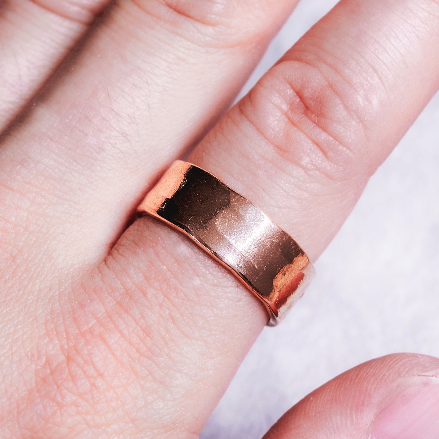 こちらのリングは、表面にゆるやかな多面のニュアンスを持たせたデザインです。鏡面のような銅の輝きに、わずかな面の変化が加わることで、光の当たり方や角度によって異なる表情を見せてくれます。装飾を抑えたシンプルなデザインだからこそ、銅そのものの色合いや素材感が引き立ち、すっきりとした印象で身につけていただけます。幅はやや広めで、手元にほどよい存在感を添えてくれる一本です。飽きのこないデザインなので、日常使いにも取り入れやすく、さまざまな装いに合わせやすいのも魅力です。