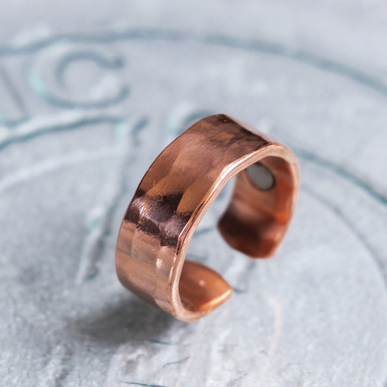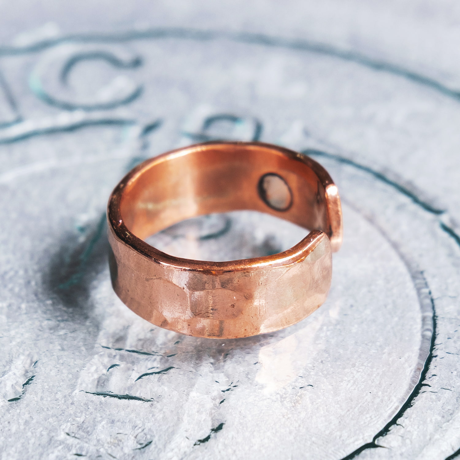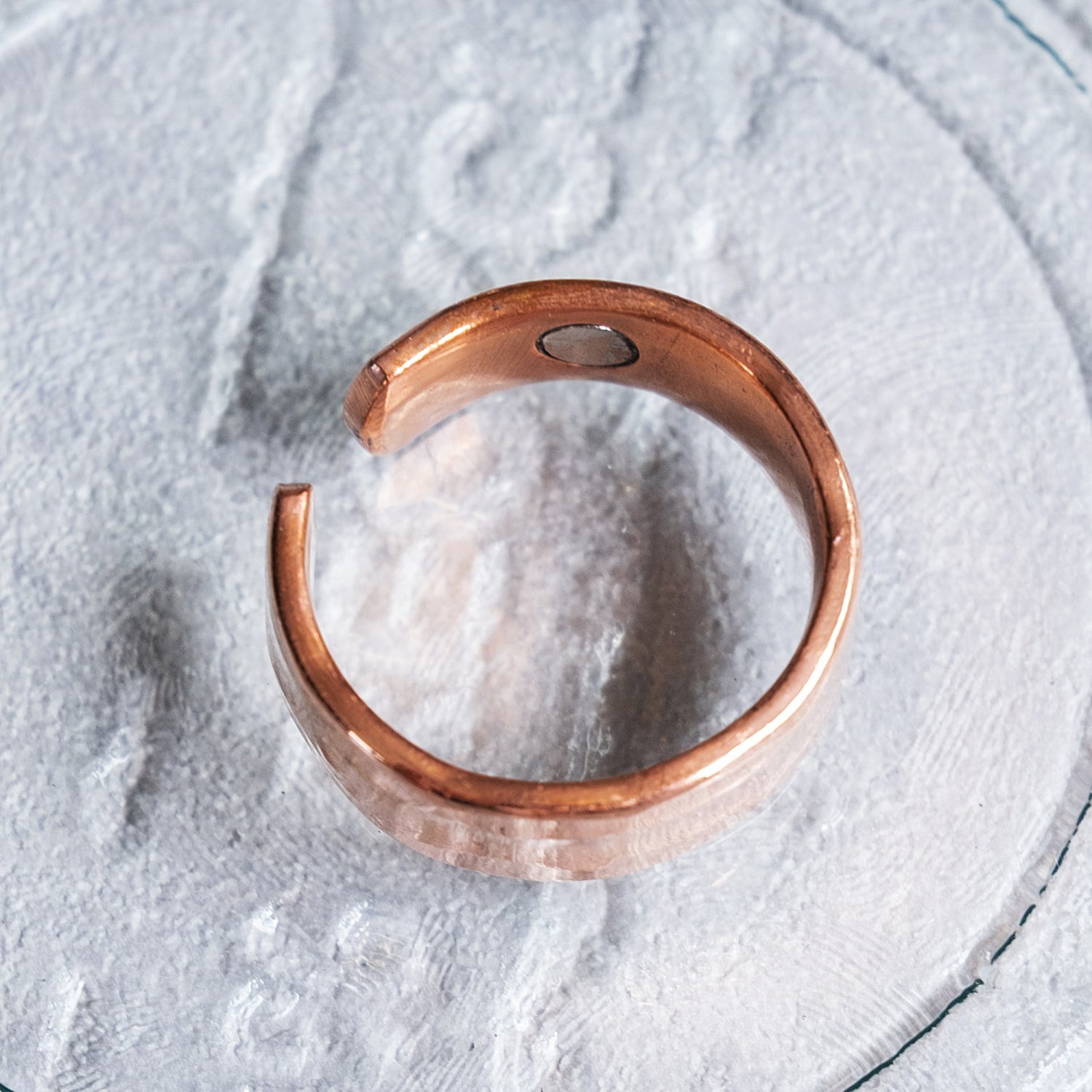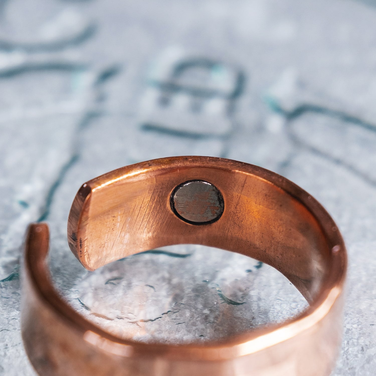このリングの特徴のひとつが、内側にマグネットを2個内蔵している点です。外から見た印象はシンプルですっきりとしていますが、内側には仕様としての個性がさりげなく込められています。銅の素材感を生かしたミニマルなデザインに、マグネット内蔵ならではのユニークさをプラスした、印象的なリングです。見た目はシンプルでも、細かな仕様に特徴のあるアイテムをお探しの方にもおすすめです。