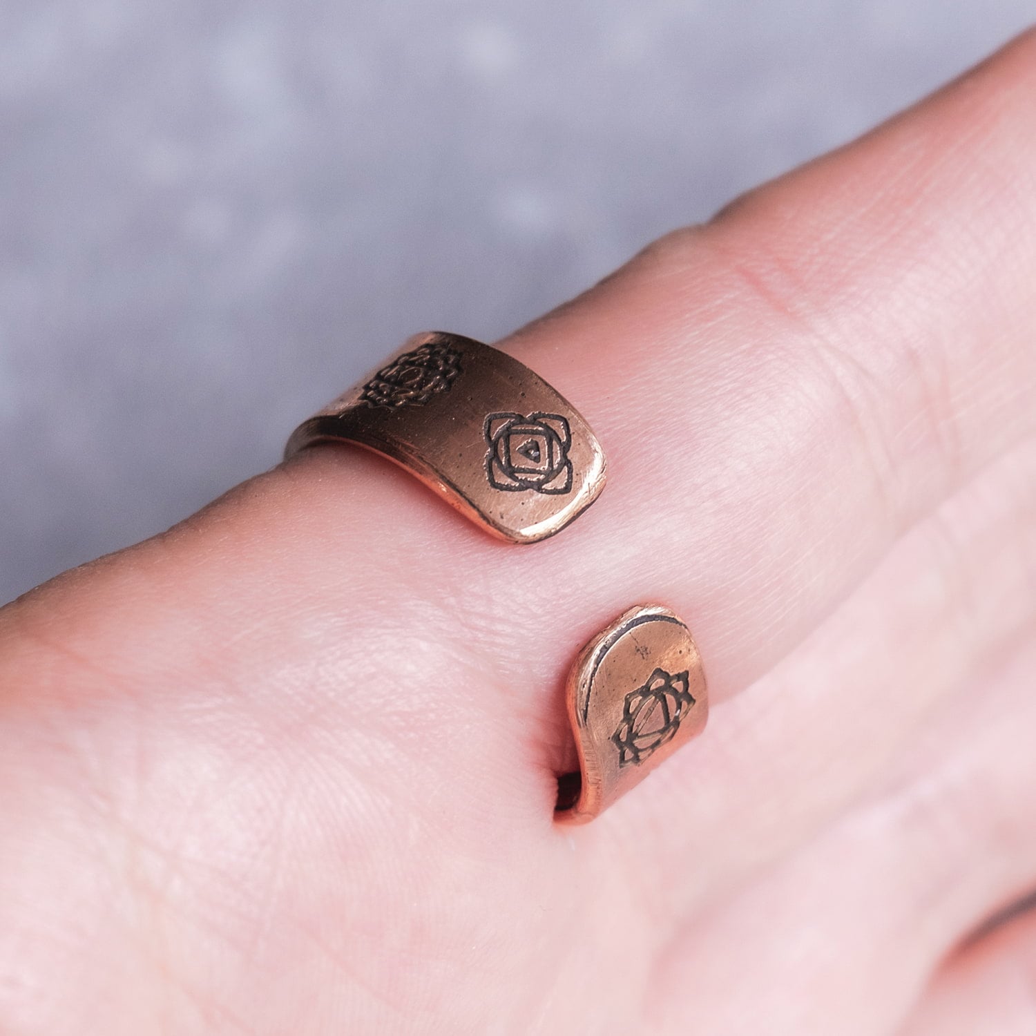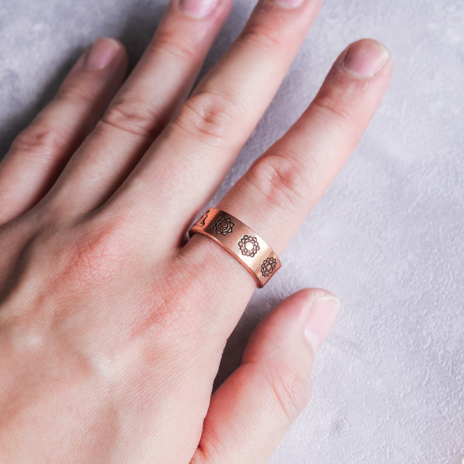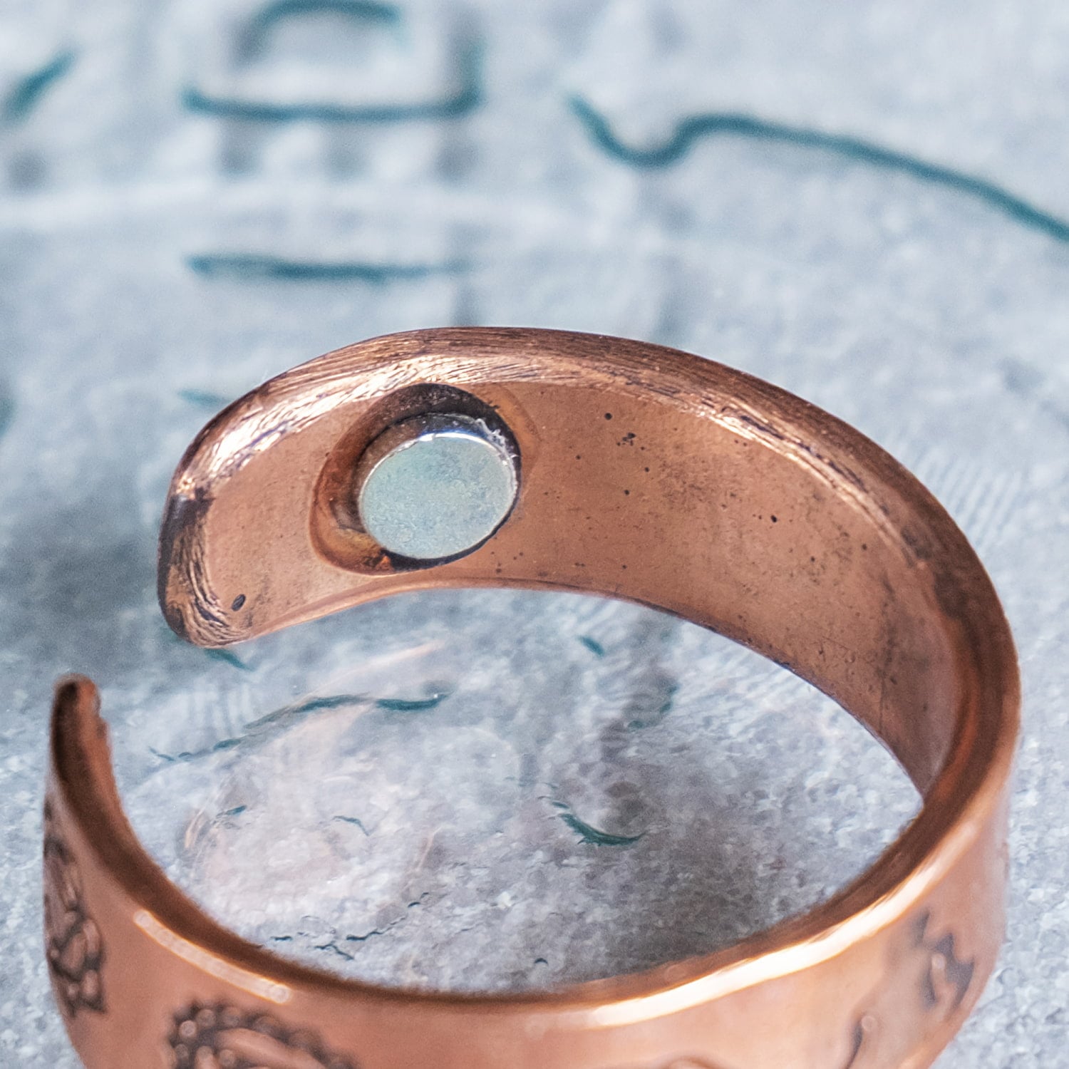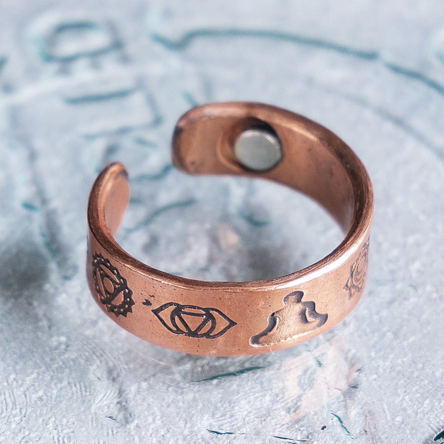このリングの特徴のひとつが、内側にマグネットを2個内蔵している点です。外側からはさりげなく、内側に仕様の個性を忍ばせた、ちょっと珍しいデザインになっています。セブンチャクラのモチーフに加えて、マグネット内蔵ならではのユニークさも楽しめるため、見た目だけでなく仕様にもこだわりたい方におすすめです。銅の風合い、チャクラの神秘性、そして内蔵マグネットの個性がひとつになった、存在感のあるリングです。