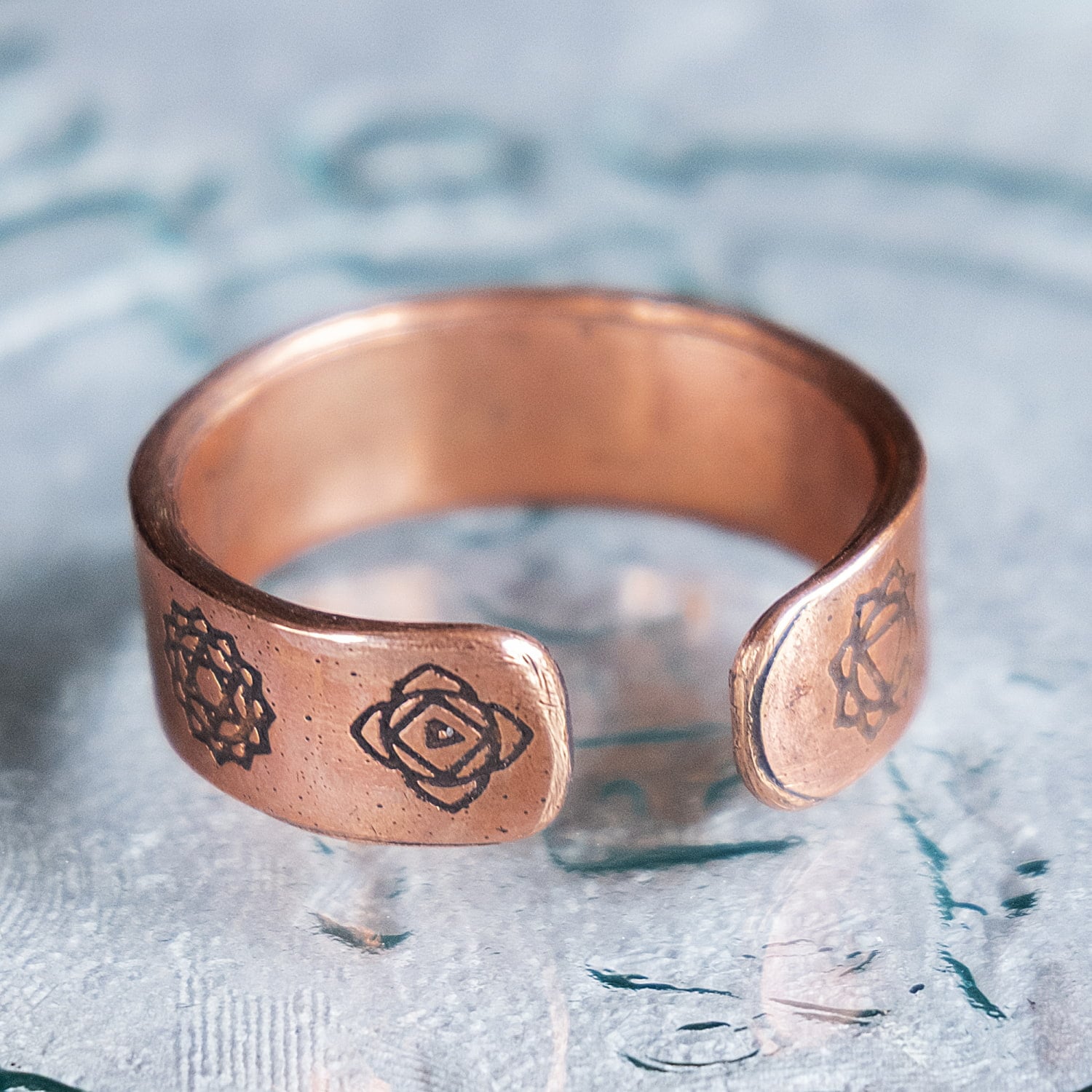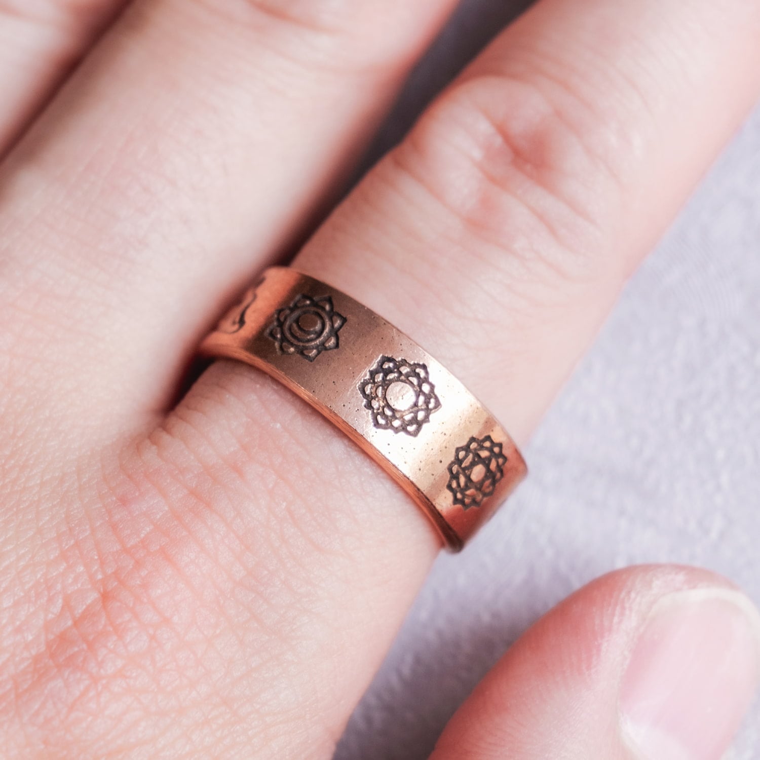 リング表面には、セブンチャクラをモチーフにした刻印が施されています。銅のあたたかみのある色合いに、インドらしい象徴的な意匠が映え、神秘的で印象的な雰囲気に仕上がっています。幅はやや広めで、手元にしっかりとした存在感を添えてくれるデザイン。派手すぎず、それでいて個性を感じさせるバランスのよさがあり、普段使いにも取り入れやすい一本です。