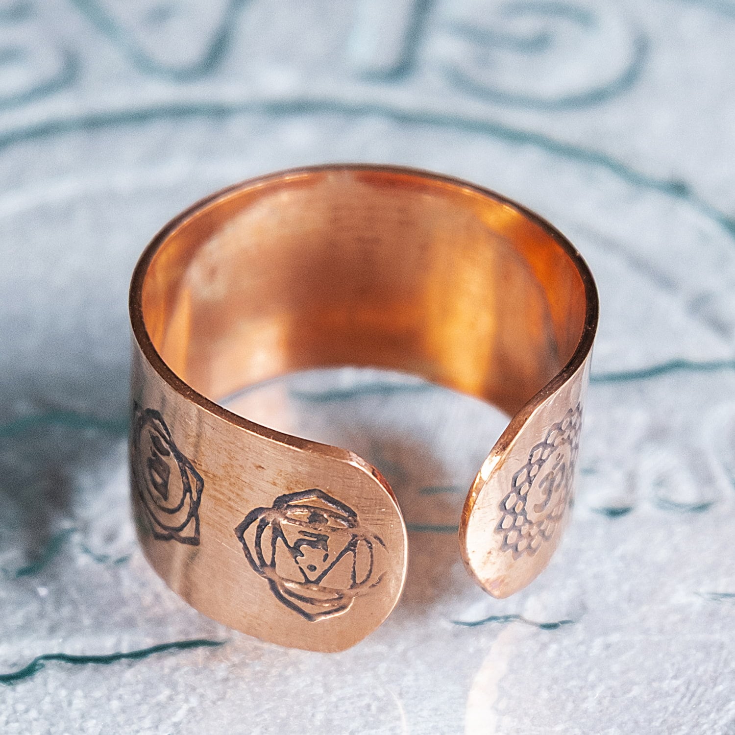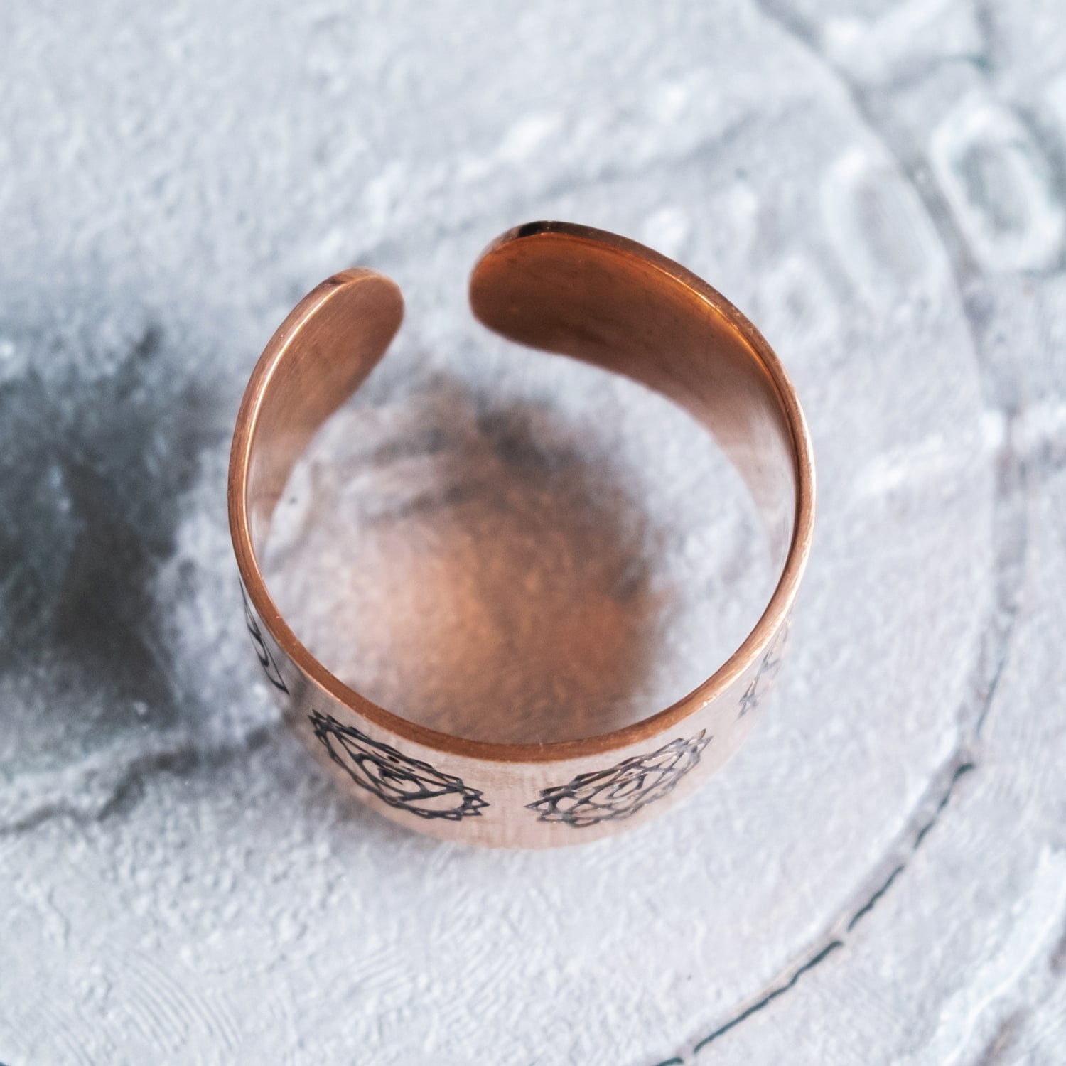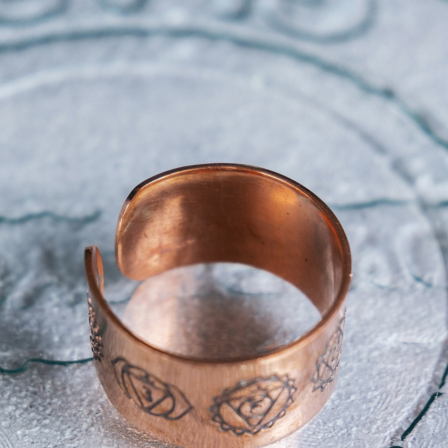 こちらのリングには、セブンチャクラをモチーフにした刻印が施されています。銅のあたたかみのある色合いに、チャクラのシンボルが並ぶことで、インドらしい神秘的な雰囲気を感じさせてくれます。幅広タイプですが、薄めで軽やかな作りなので、見た目ほど重たくなりすぎず、普段使いにも取り入れやすいデザインです。■フリーサイズ(17号以上)です