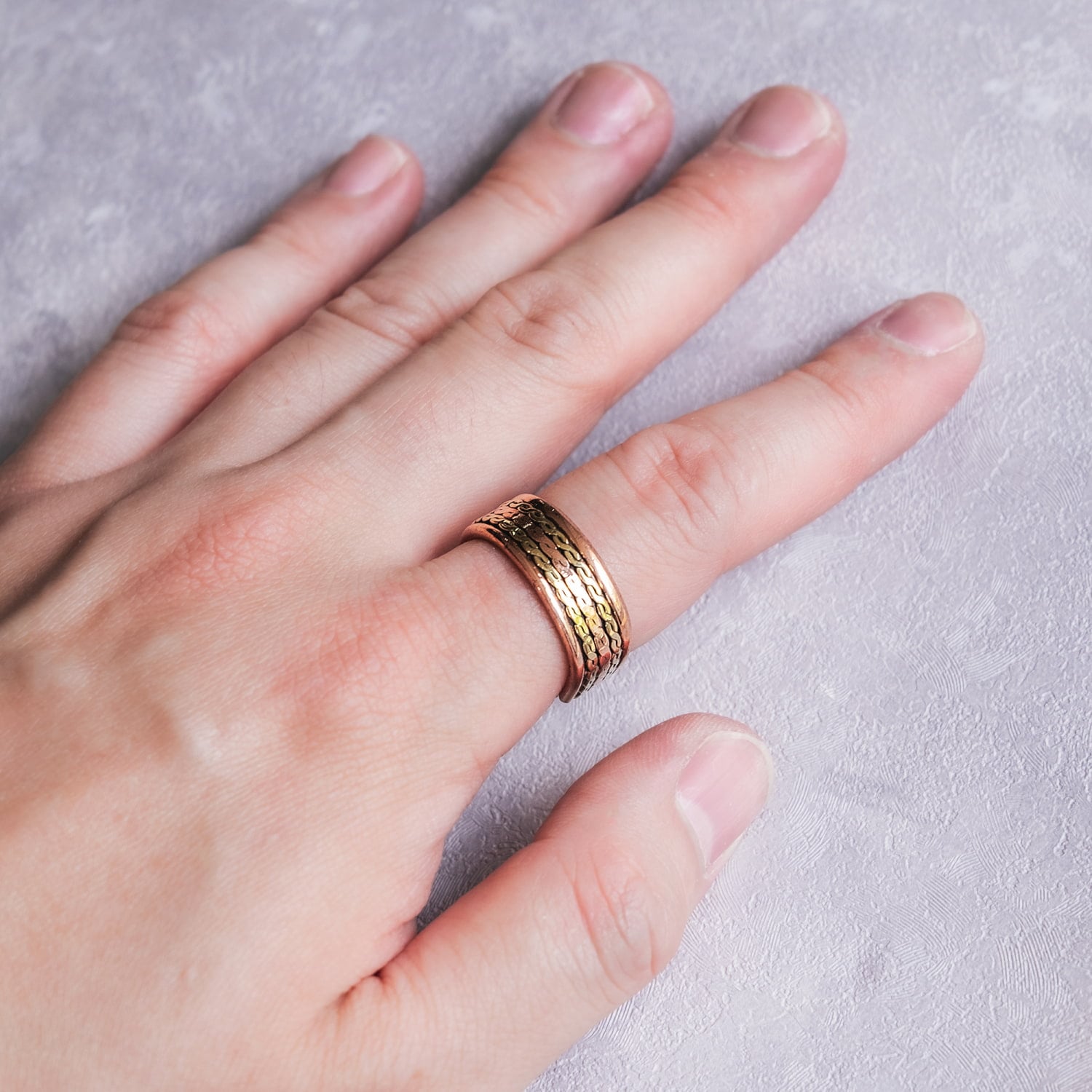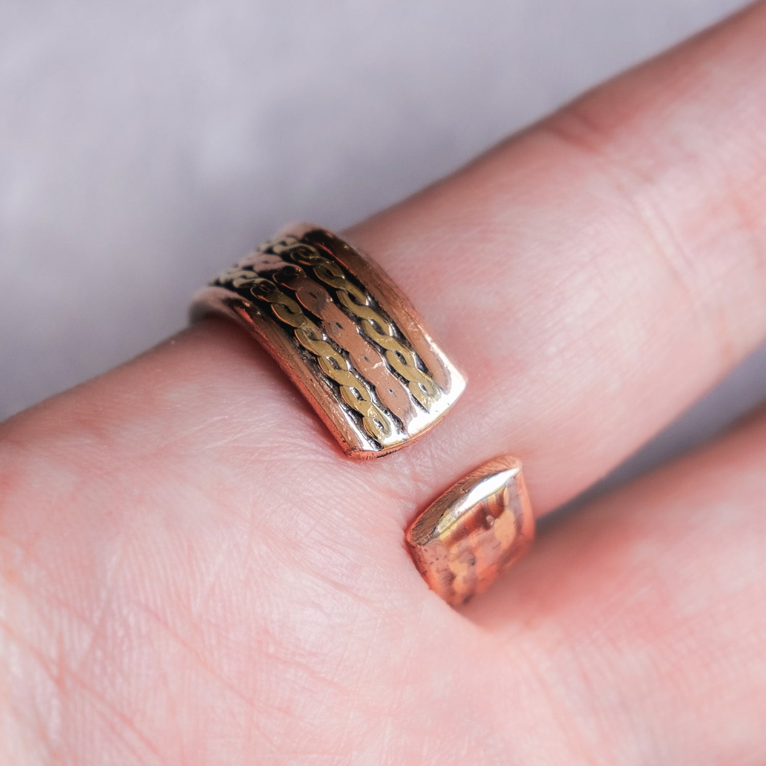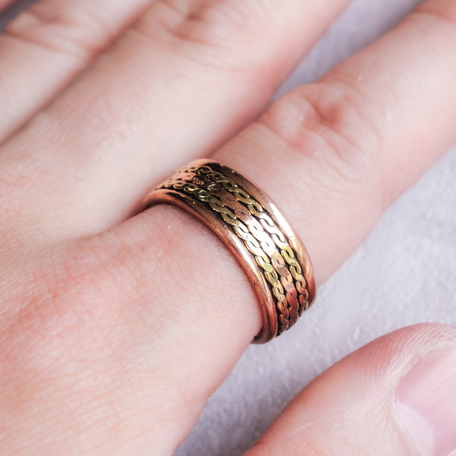 こちらのリングは、表面にブラス装飾が施された個性的なデザインです。あたたかみのある銅の色合いに、ブラスのやや明るい輝きが加わることで、表情豊かで華やかな印象に仕上がっています。ブラスと銅が螺旋状に絡み合うような模様が施されており、流れるようなラインが手元に動きと立体感を添えてくれます。単色のリングにはない奥行きがあり、ほどよい存在感を楽しめる一本です。幅はやや広めですが、華美になりすぎず、普段の装いにも取り入れやすいデザインになっています。
