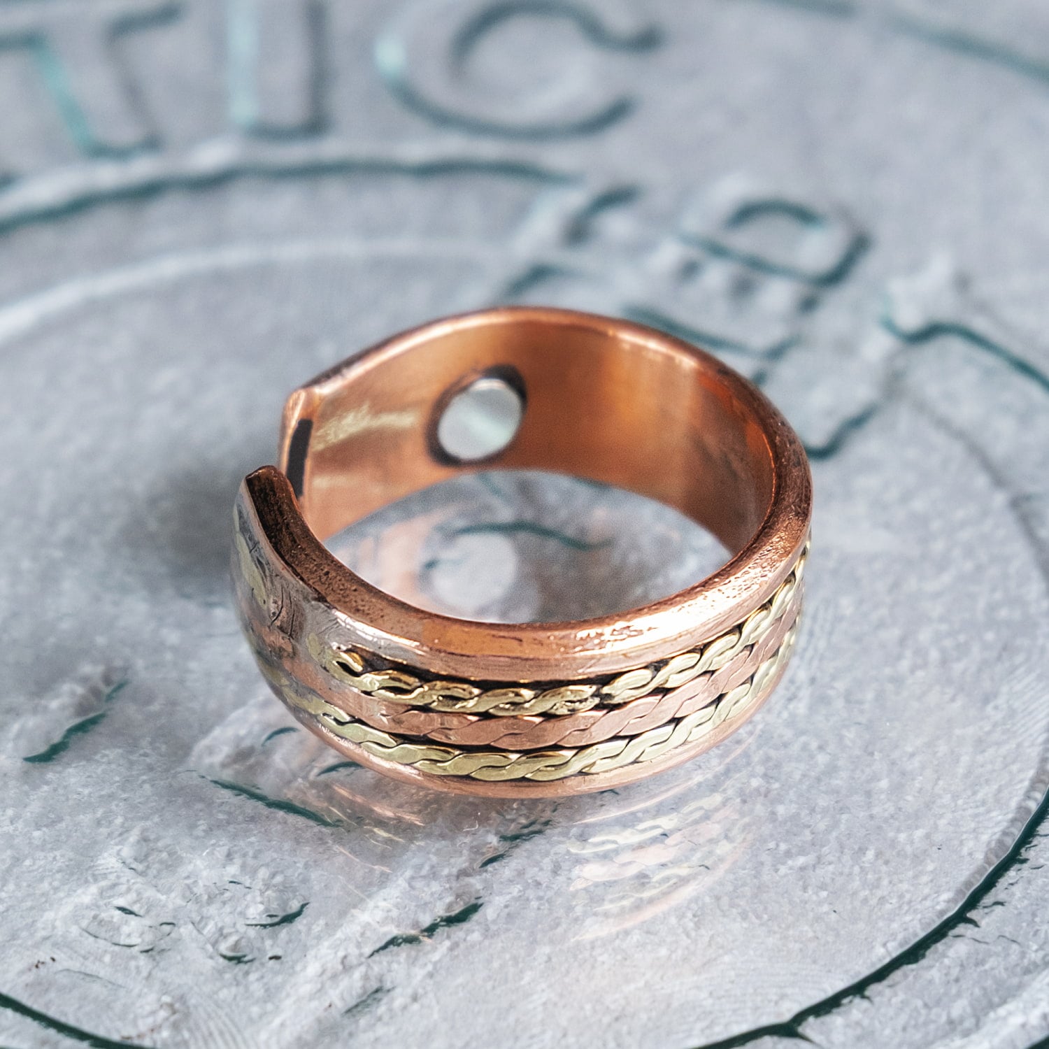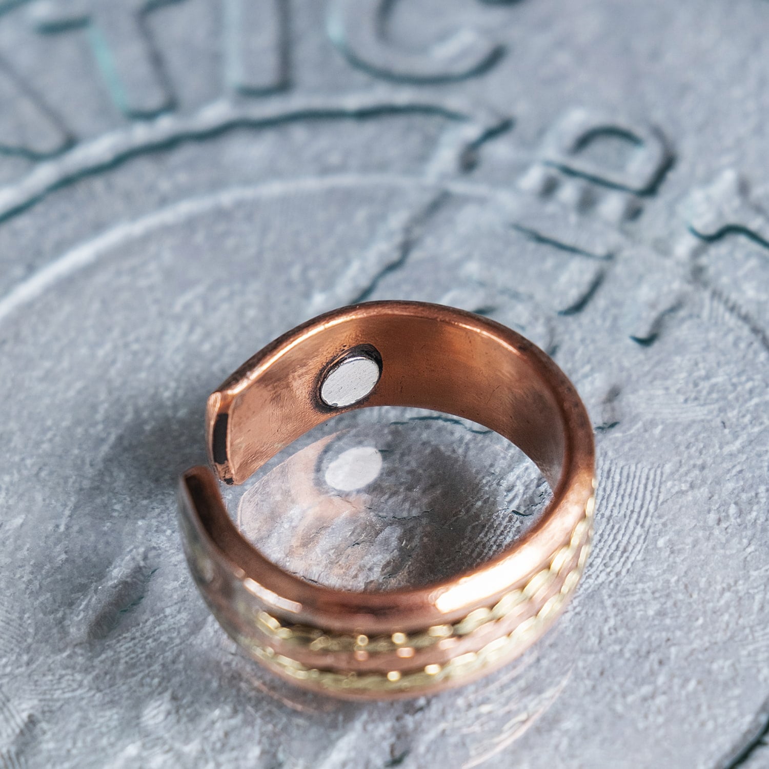 このリングの特徴のひとつが、内側にマグネットを2個内蔵している点です。表面はブラスと銅の装飾が目を引くデザインでありながら、内側には仕様としての個性もさりげなく込められています。素材のコントラストが楽しめる見た目の美しさに加えて、マグネット内蔵ならではのユニークさもあわせ持ったリングです。銅の風合い、ブラスの華やかさ、そして内蔵マグネットの個性がひとつになった、印象的なアイテムです。