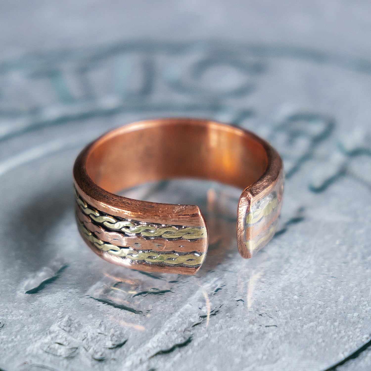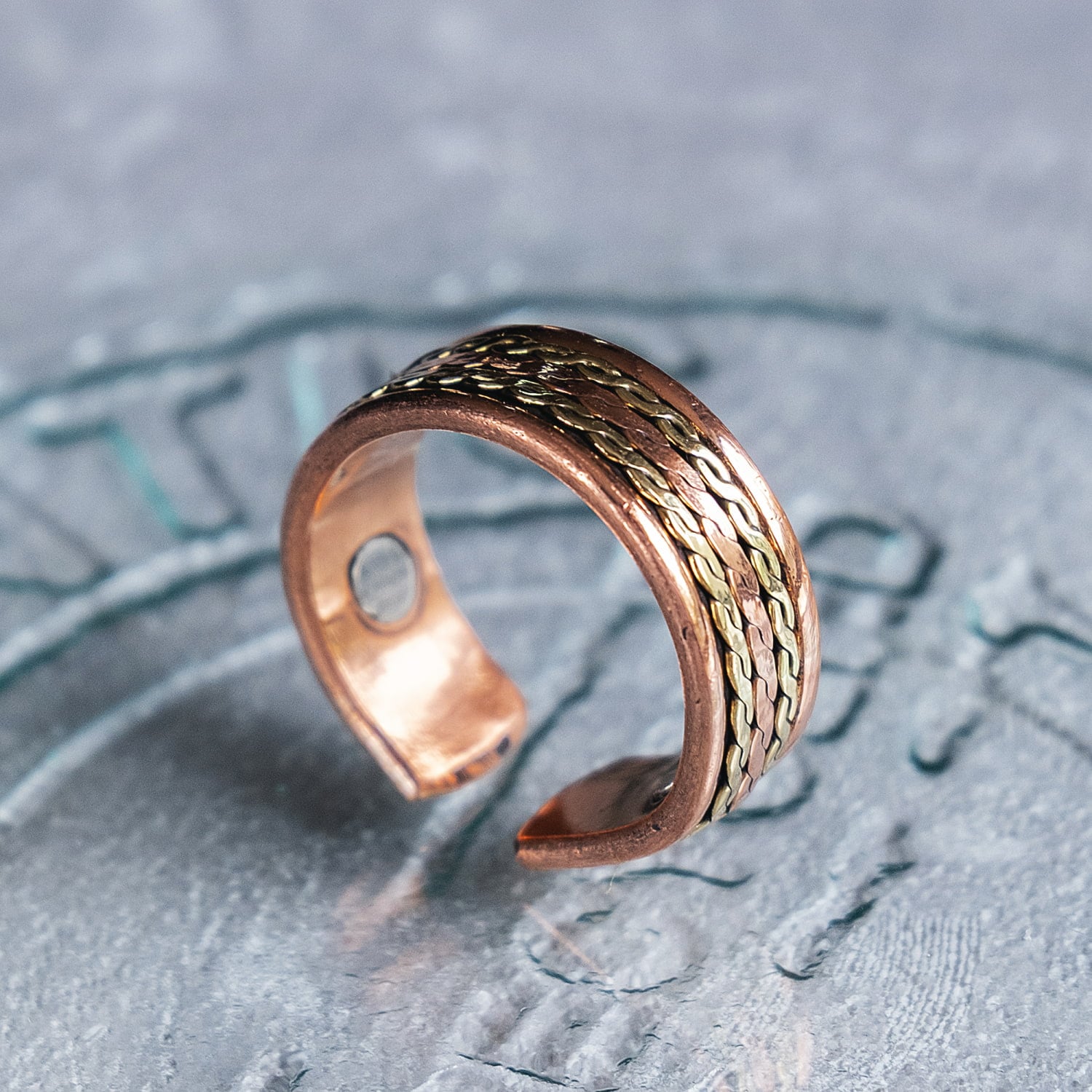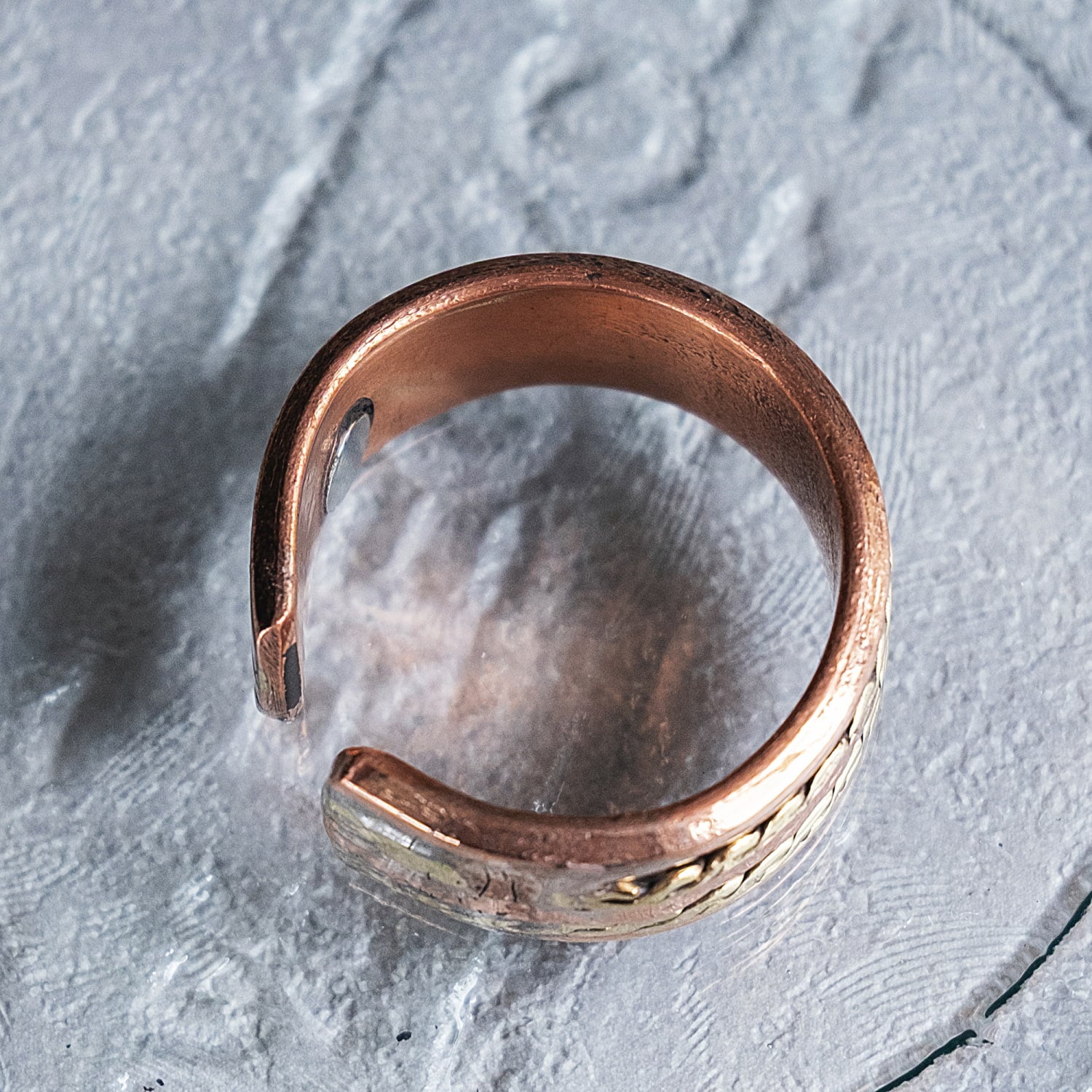 キーワード:アーユルヴェーダ 銅製リング 純銅 フリーサイズ指輪 インドアクセサリー ヒンドゥー教 プージャ用品 ブラス 真鍮 ブラス装飾 ツートンリング スパイラルデザイン マグネット内蔵 磁石内蔵 銅リング フリーサイズリング ハンドメイドジュエリー